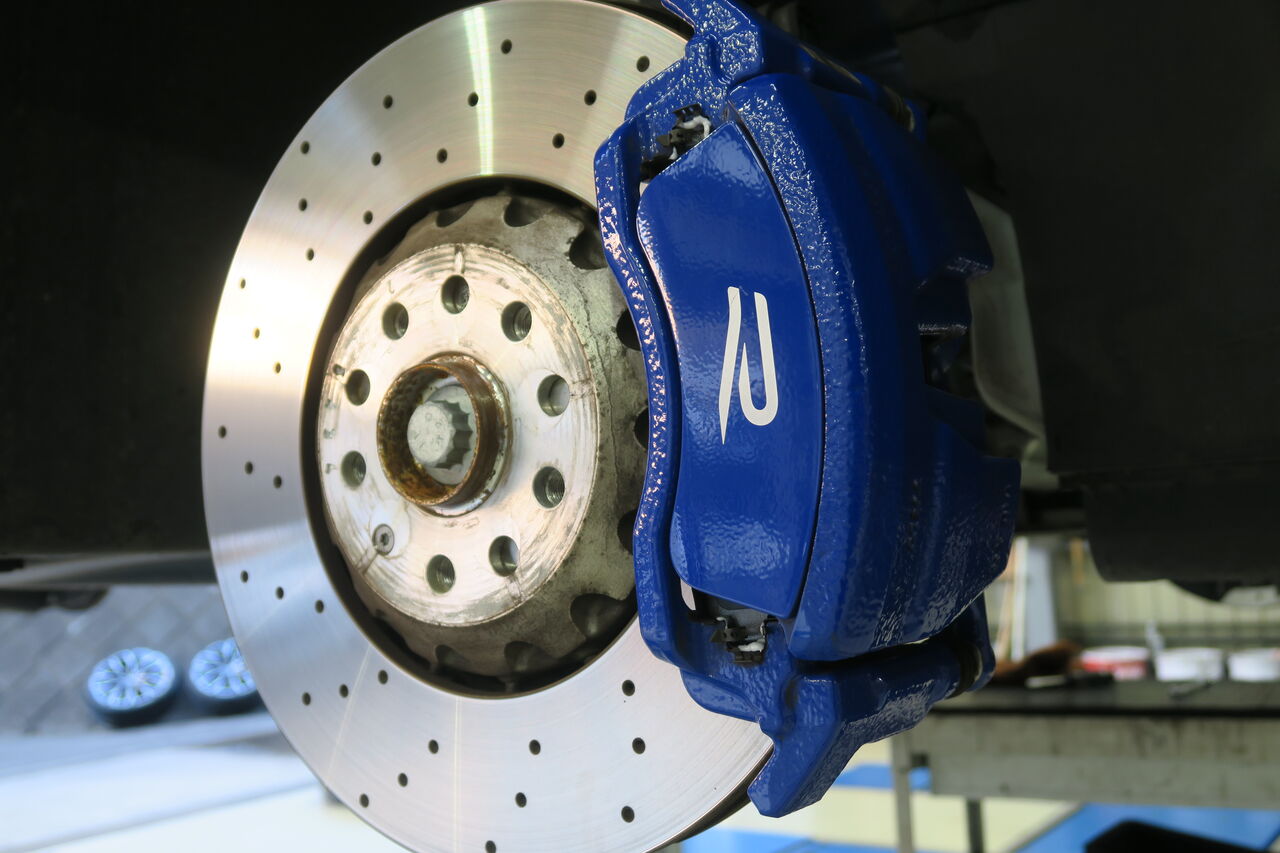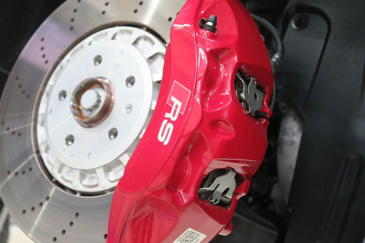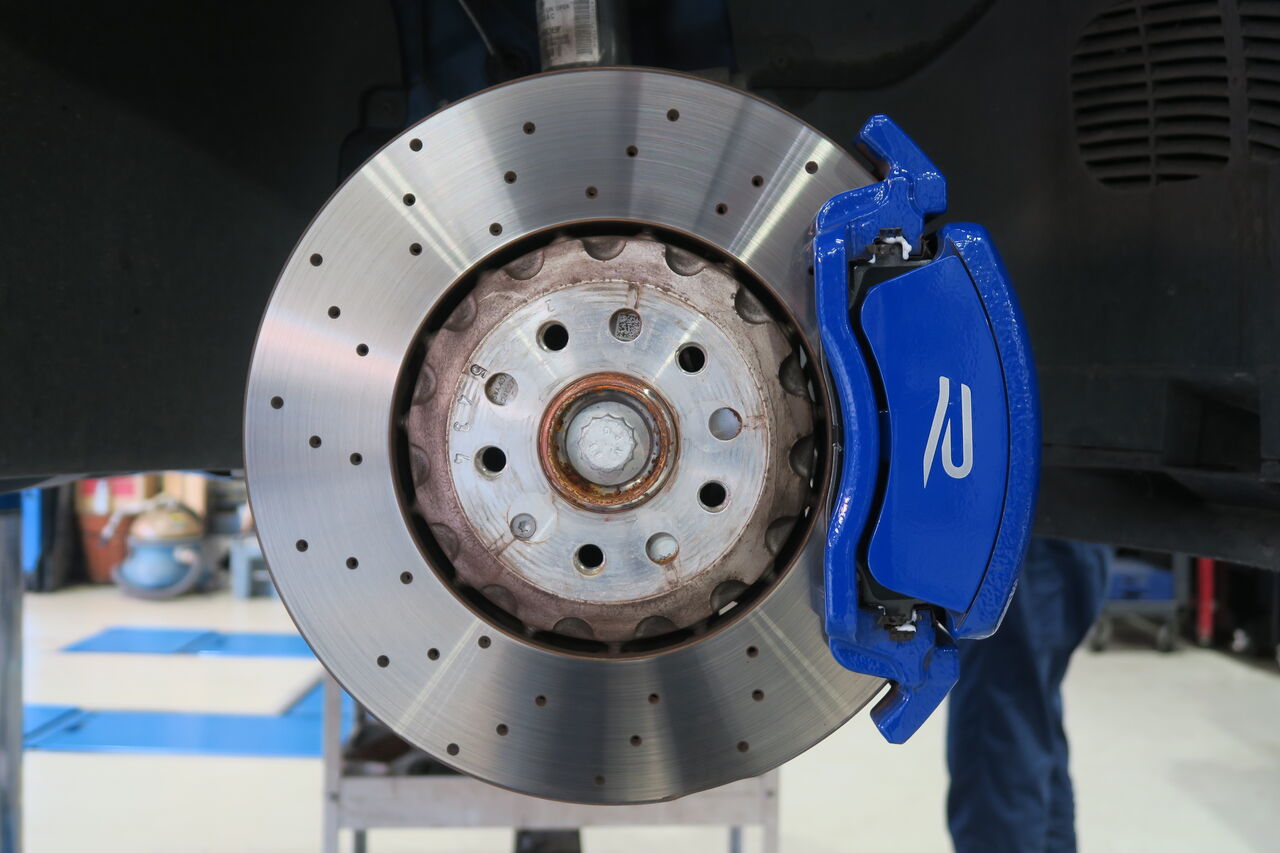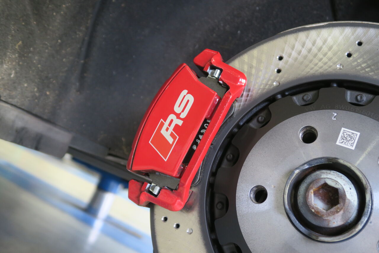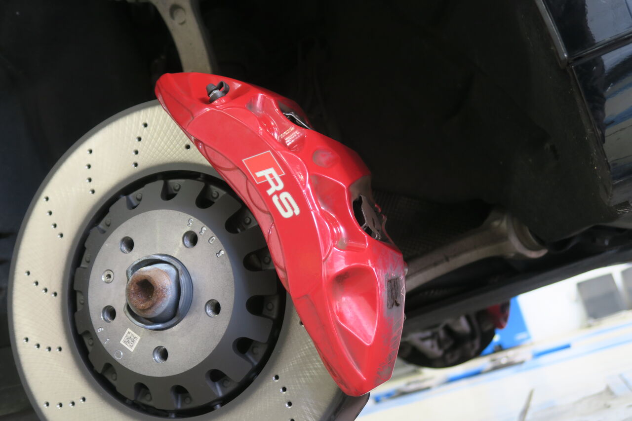 RS5(B9)のブレーキパッド&ローター交換でご来店いただきました。サーキット走行を見据えてブレーキパッドには「iSWEEP IS3000」をお選びいただきました。IS3000はロースチール材を採用したブレーキパッドでサーキット走行や峠の連続走行などブレーキローターが高温の状態を維持するようなシチュエーションで本領を発揮します。ブレーキローターも摩耗がありましたので純正品を使用して交換しました。合わせてブレーキフルードも耐熱性に優れる「iSWEEP RACING BF」に交換させていただきました。フルードは許容温度を超える熱を受けると沸騰し、ブレーキ性能を著しく低下させてしまうため走行条件に見合ったグレードの使用をオススメしております!
