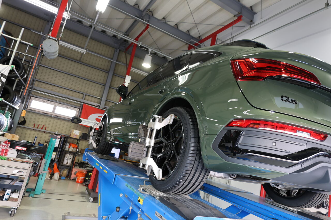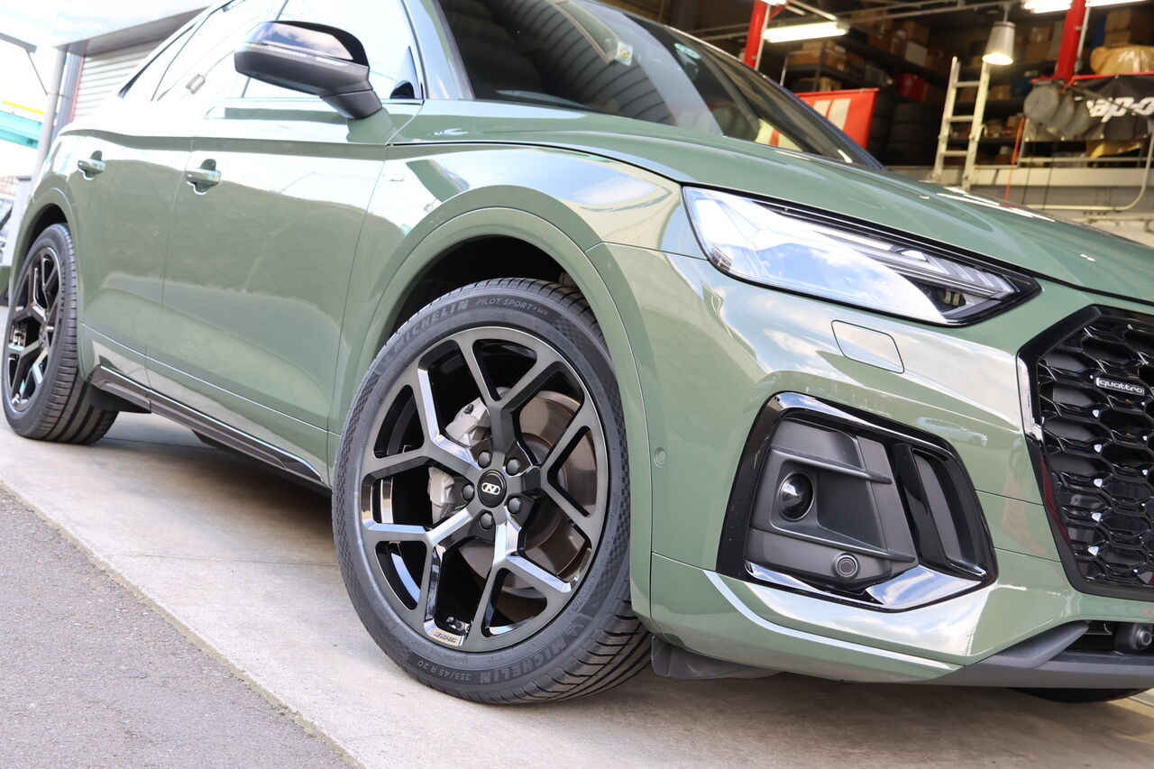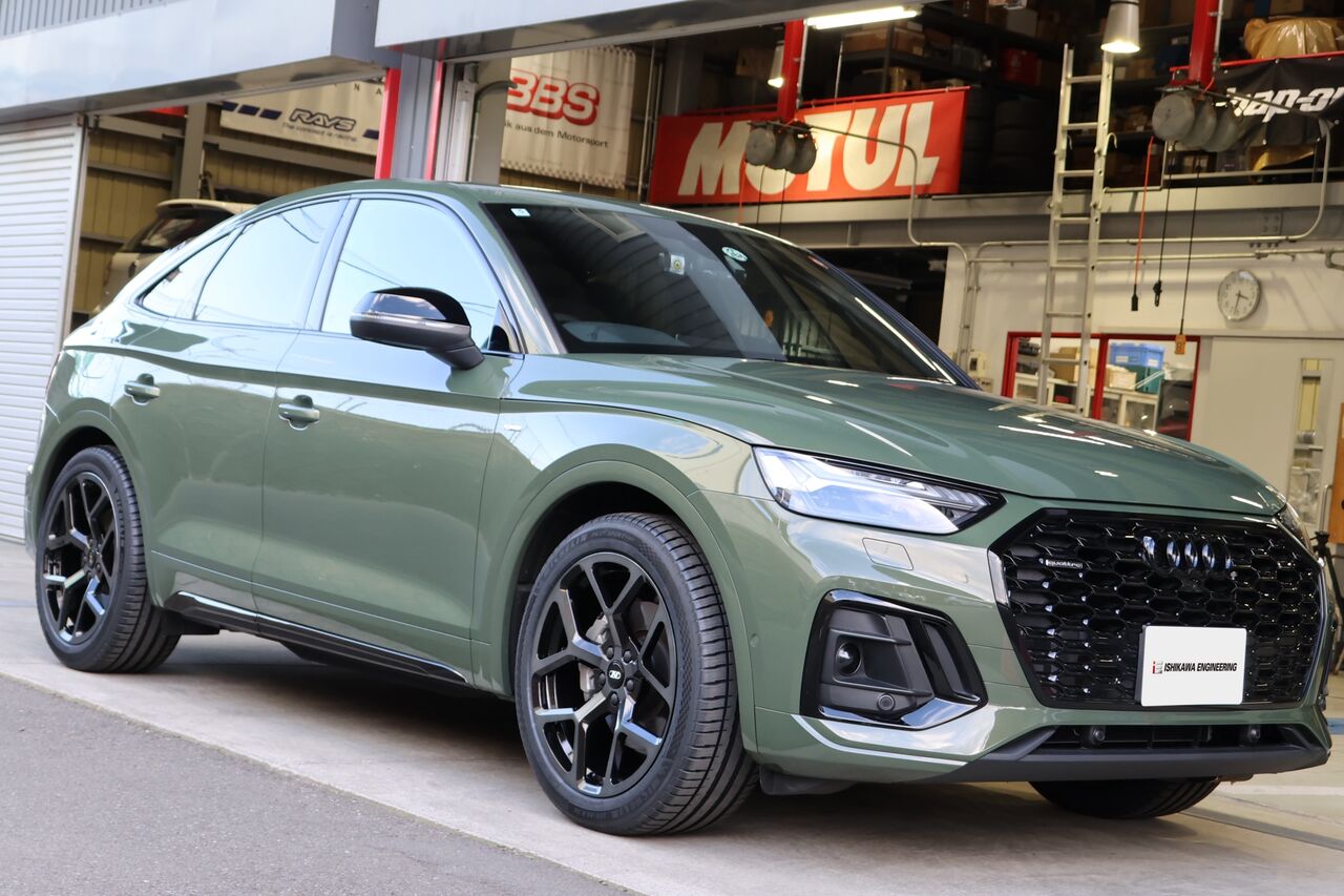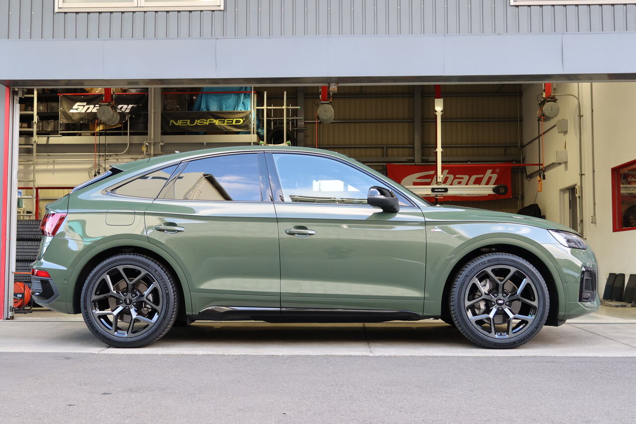 Q5 (FY) 40TDIに「iSWEEP Upgrade Spring」と「iSWEEP Rear Stabilizer」を装着させていただきました。車高のダウン量は純正比フロント約30mm、リア約40mmダウンとなりました。iSWEEP Upgrade Springは車高が下がるだけでなく乗り心地も純正に比べて突き上げ感が少ないため快適にドライブを楽しんでいただけます。同時に装着させていただいたiSWEEP Rear Stabilizerはアップグレードスプリングと組み合わせることで、コンフォート性を損なうことなく高速走行やワインディング走行時の安定性を向上させます。純正スプリングと組わせることも可能です!合わせてホイールに「NEUSPEED RSe103 20x9.0 +35」をお選びいただき、ワイルドでありながらスタイリッシュさを併せ持った2×5本のスポークが車体のデザインとのマッチングも良く足元を引き締めます。タイヤは快適性と強度のバランスに配慮したSUV専用設計の「MICHELIN Pilot Sport 4 SUV 255/45R20」を組み合わせました。