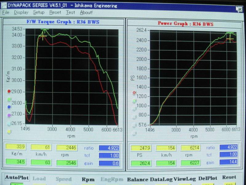 R36 BWSのNEUSPEED JSP-Chipの開発が終了しました。パーワーグラフはダイノパックで計測した生データです。ノーマルの実測値では247.9PSでした。4Motionの場合は駆動系のロスもありますのでこれが普通です。JSP-Chip施工後の変化はグリーンのラインになります。分かりやすくするためにカタログ数値に変換すると、出力は298.9PS>316.7PS、トルクは35.7kg/m>36.5kg/mにアップ。N/Aなのでターボほどの劇的な変化は無理ですが、トルクバンドが全域で拡大することで乗りやすくなります。また、加速フィーリングも格段に良くなり高回転域までストレスなくきっちり回ります!R36が更に楽しくなること間違いなしです。