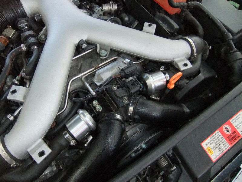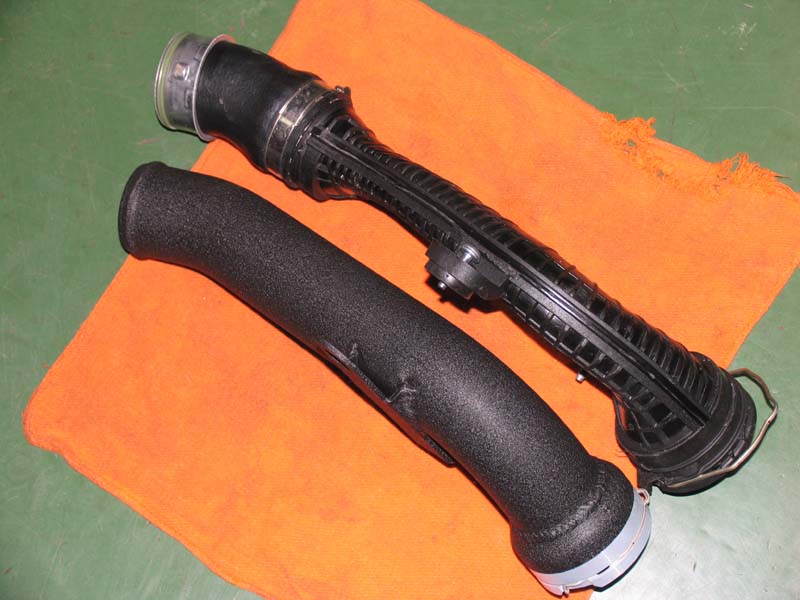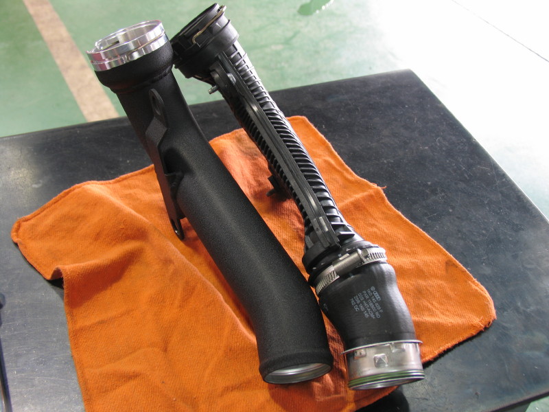 NEUSPEED JSP-Chipのインストールと併せて、K&NリプレイスメントエアフィルターとNEUSPEED ハイフローディスチャージコンバージョンパイプに変更します。 CCZはご覧のように純正パイプはかなり変形してつぶれたプラスティック製のパイプです。過給圧と高い過給圧を持続させるJSP-Chipではエアフロー効率の向上によるメリットは大きいのです。