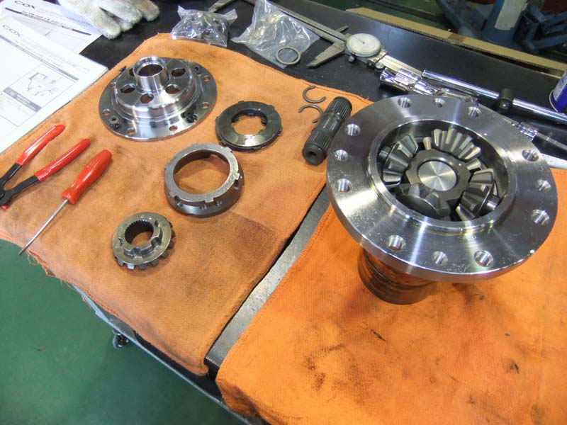 純正のデフからリングギア、シャフトなどを取り外し、COX LSDに移植して組み付けます。そして、元通りに組み直して完成です。 このミッションでサーキットを走るんですね。きっと良いタイムが出るでしょう! 結果が楽しみですね。