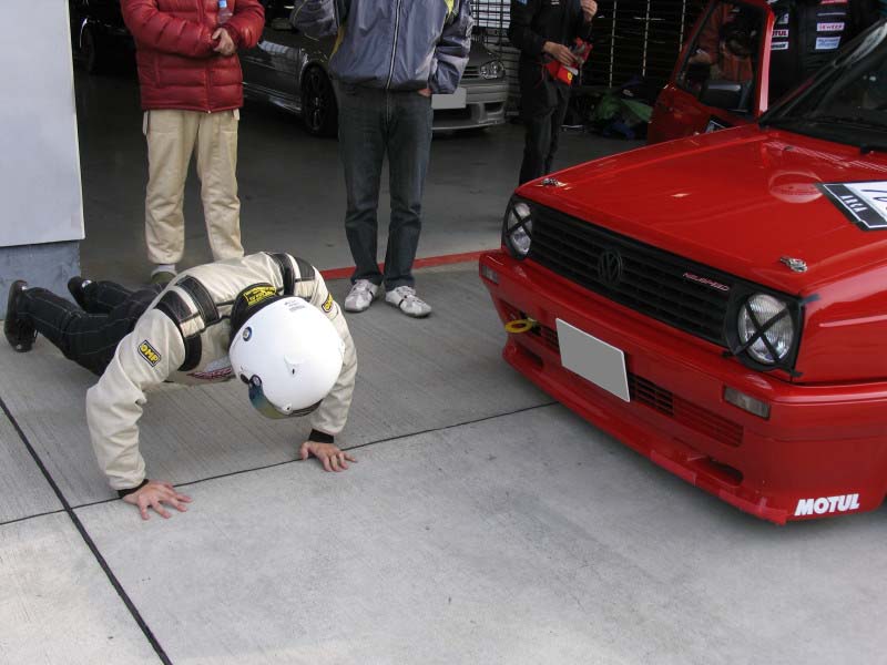 ETCC 3時間半の耐久レースにI.S.D.C.のメンバーで参戦しました。んっ!なんで腕立て? 耐久のルールでドライバーは乗る前に腕立て伏せを20回しなければなりません。
