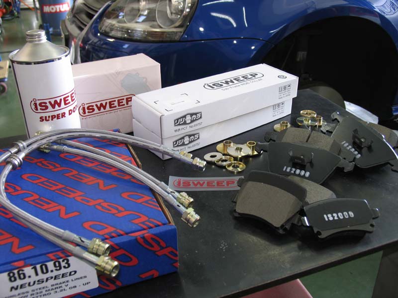 GOLF5 R32のお客様は、ダスト対策でIS1500を検討していましたが、使用目的から純正よりもしっかりとした効きとコントロール性がアップする『iSWEEP IS2000』に交換。ブレーキラインもステンメッシュにする事でさらに効果をアップさせることができます。