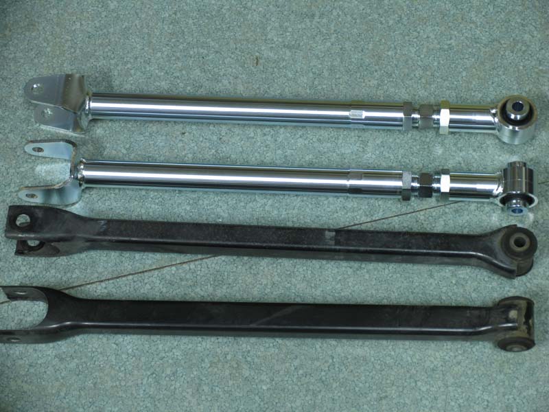 リアキャンバーとトー角を適正値にするため、iEXERTアジャスタブルリアコントロールアームに交換です。リアのコントロールアームは左右上下計4本使用していますが、今回は4本をすべて交換して調整です。調整式アームを4本使用することでキャンバー角とトー角を個別に調整することが可能となっています。車高ダウンによるリアのネガティブキャンバーでお悩みの方にお勧めです!
