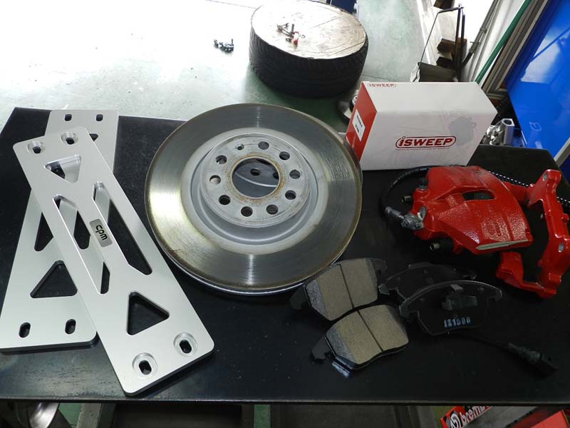 GOLF6 1.4TSIへGOLF6 GTI用キャリパーにブレーキアップグレードしました。今回はパットも『iSWEEP IS1500』にし、ダスト対策もOKです。GTI用のブレーキはローター径が大きくなっていますが、無加工で取り付けられます。
