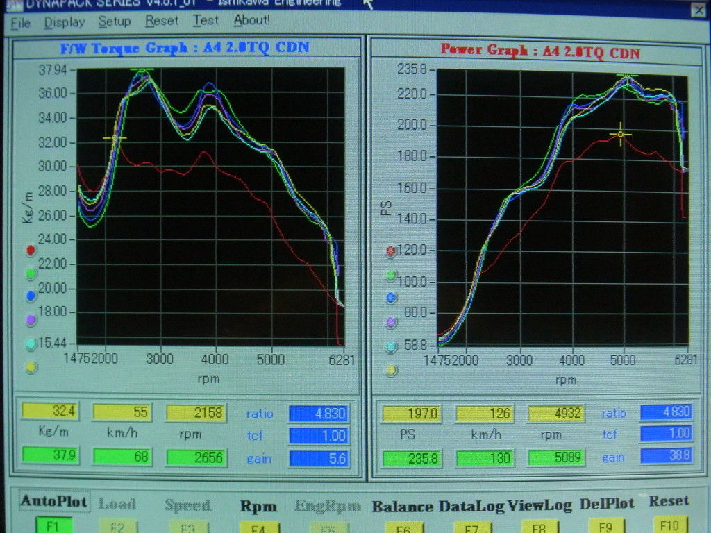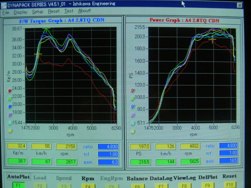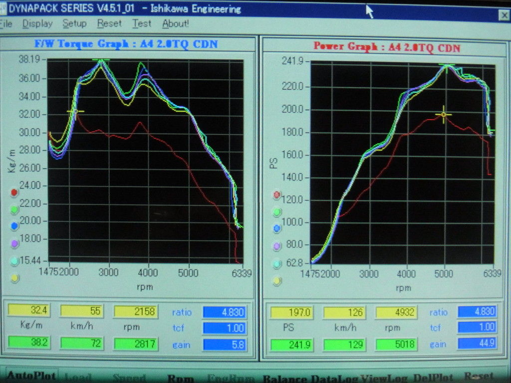 こちらは、ダイノパックで測定したA4 B8 CDNのパワーグラフです。赤の実線が純正プログラムで、緑、紺、桃、水色、黄がJSP-Chipのテスト結果です。左側のグラフはある程度合わせ込んだあとのプログラムですが、純正のトルクラインを嵩上げしたようなトルクラインになっているが分かります。ただ、まだパワーがそれほど出ていません。真ん中のグラフは各補正マップの修正を加えてだいぶパワーが上がってきました。右側がほぼ完成のプログラムのテスト結果です。テストプログラムはそれぞれ5回連続して計測した結果、ほぼ同じ軌跡を辿っているのがわかりますね。そのプログラムの特徴です。ここで補足ですが、それぞれのプログラムではほぼ同じ過給圧(ブースト圧)設定です。単にブーストが高い、低いだけで性能が決まるわけではないことに注目して下さい。 もし、JSP-Chipが現車セッティングでなかったら、このような修正は出来ません。もし、左のプログラムをインストールされても『それなりに速い』と思う筈です。