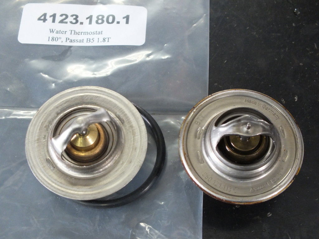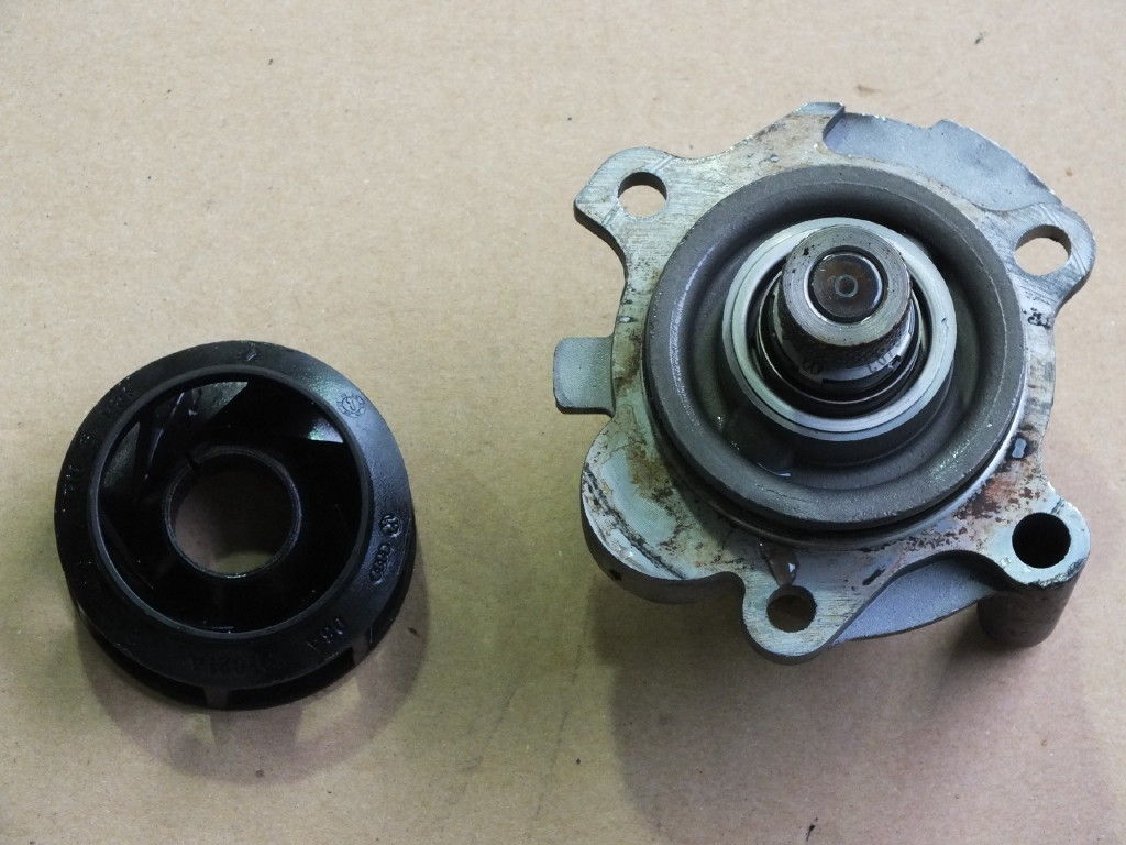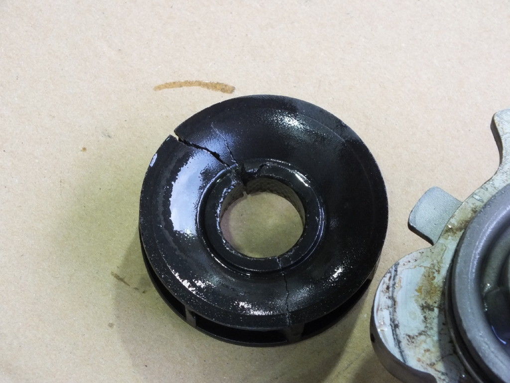 こちらは破損したウォーターポンプですが、軸からポンプの羽の部分が完全に分離しています。この結果、冷却水をラジエーターに循環させることが出来ずにオーバーヒートを引き起こします。今回は同時にサーモスタットも交換しました。サーモスタットも最近故障原因の多いパーツなので念のためです。