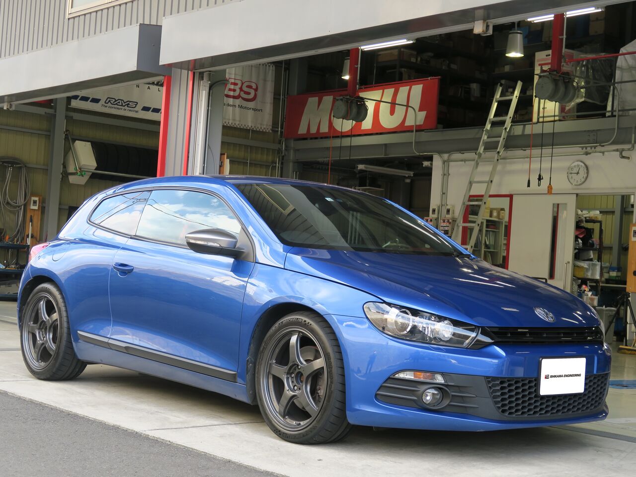 iSWEEP Suspension System COMPETITIONを装着されているワーゲンシロッコです。タイヤ交換をして富士スピードウェイ(ショート)を走ったら摩耗痕が変化した、とのことで4輪アライメントの再調整です。アライメント調整時は摩耗していない状態でセッティングすることでタイヤ交換によるアライメントのずれを防ぐことができます。By内田