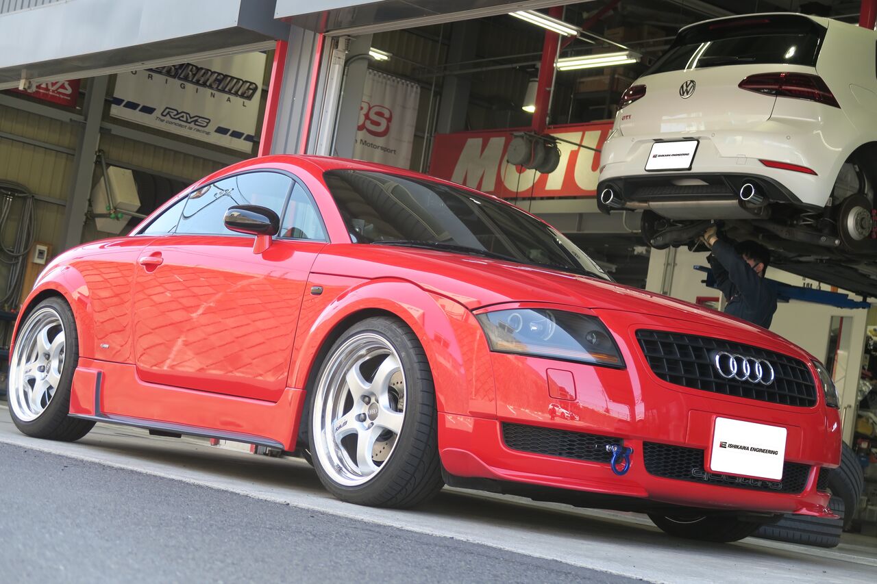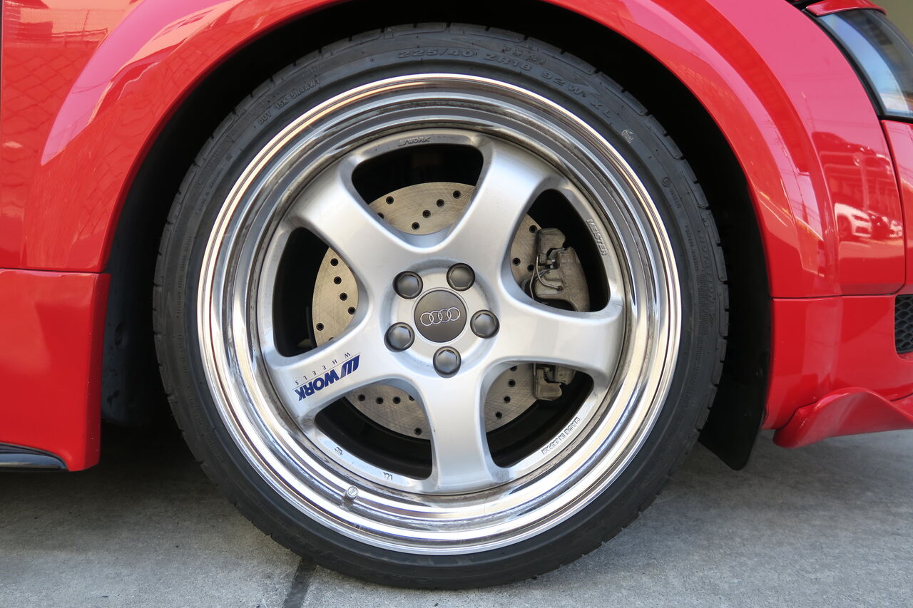 TT 8N 1.8TQのブレーキリフレッシュです。フロントブレーキローターをNEUSPEEDブレーキロータードリルドタイプ、ブレーキパッドはiSWEEP IS1500に交換しました。ホイールの奥から見えるドリルドローターが迫力満点です!IS1500は低ダストでありながら市街地走行で十分な制動力があり踏力に応じた制動特性が特徴のブレーキパッドです。カッコいいホイールがブレーキダストで汚れず綺麗な状態を保つことができます!