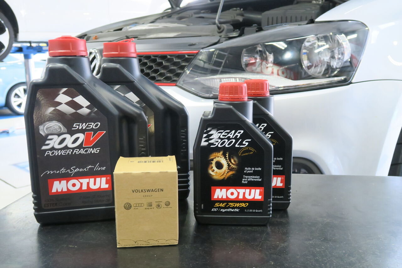 POLO 6R GTIの7速DSGのミッションオイル交換とエンジンオイル交換でご来店いただきました。使用したオイルはエンジンにMOTUL 300V Power Racing 5W30、ミッションオイルにMOTUL GEAR300LS 75W90です。