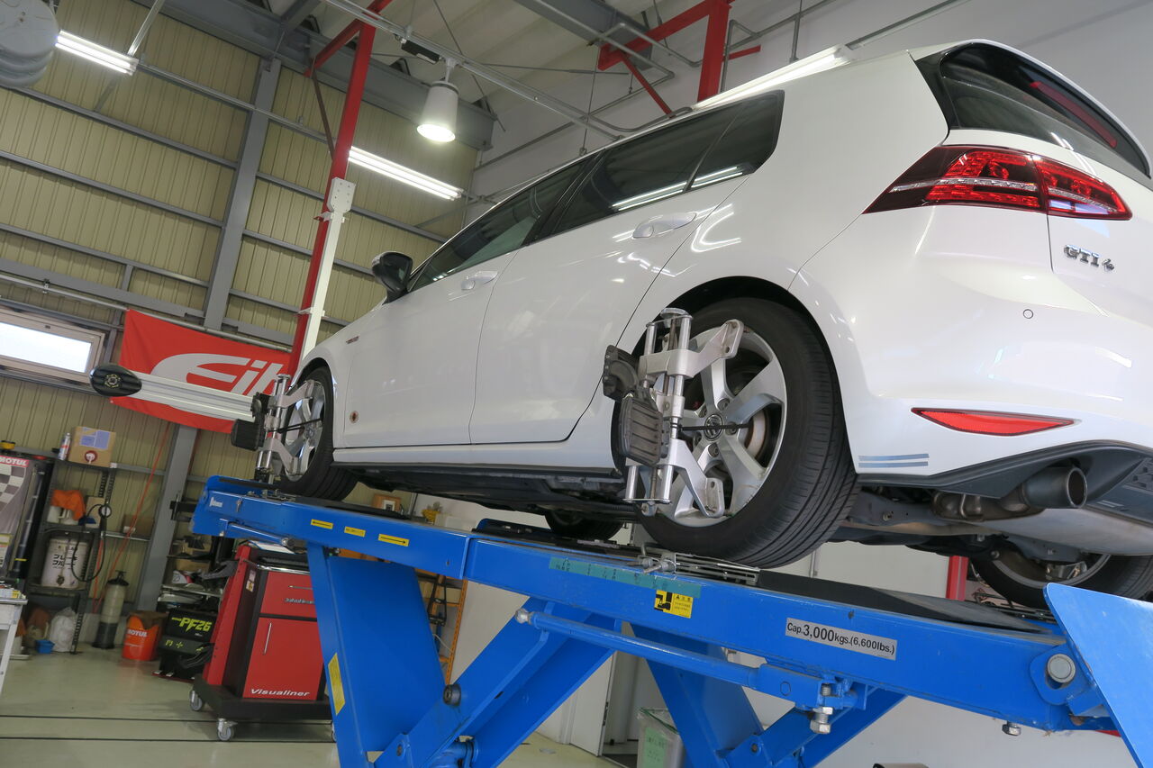 GOLF7 GTIの車検整備とBILSTEIN B14の装着でお預かりしました。車検整備では大きなトラブルはありませんでしたがリアブレーキパッドの残量が少なかったためiSWEEP IS1500を使用して交換させていただきました。BILSTEIN B14は車高調整式サスペンションのため今回お客様の要望に合わせて純正比約15ミリダウンに調整させていただきました。BILSTEINの推奨車高に調整しましたが純正サスペンションのへたりもあったためダウン量は少なくなりました。BILSTEIN単筒倒立ダンパーによりストリートからワインディング、高速道路までしっかりと安定した走りを実現するのでGTIの軽快な走りを足元から支えてくれます!
