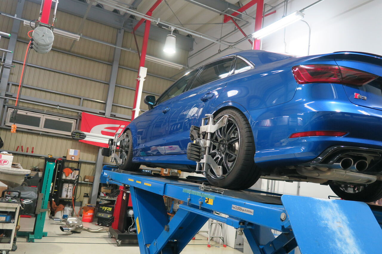 iSWEEP車高調整式サスペンションシステム「SPORT」を装着しているS3 (8V)の車高調整と4輪アライメント調整でご来店いただきました。車高調整式サスペンションの利点としてお客様の好みに合わせて車高を微調整することが可能なため理想的なフォルムにすることが可能です。今回車高調整に伴い4輪アライメント測定・調整を行いました。アライメントはサスペンションやブッシュなどの経年劣化や車高の変化によって起こります。ホイールアライメントを適正な位置にすることで走行安定性が向上し軽快になります。気になる方はお気軽にご相談ください!