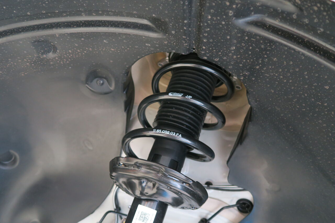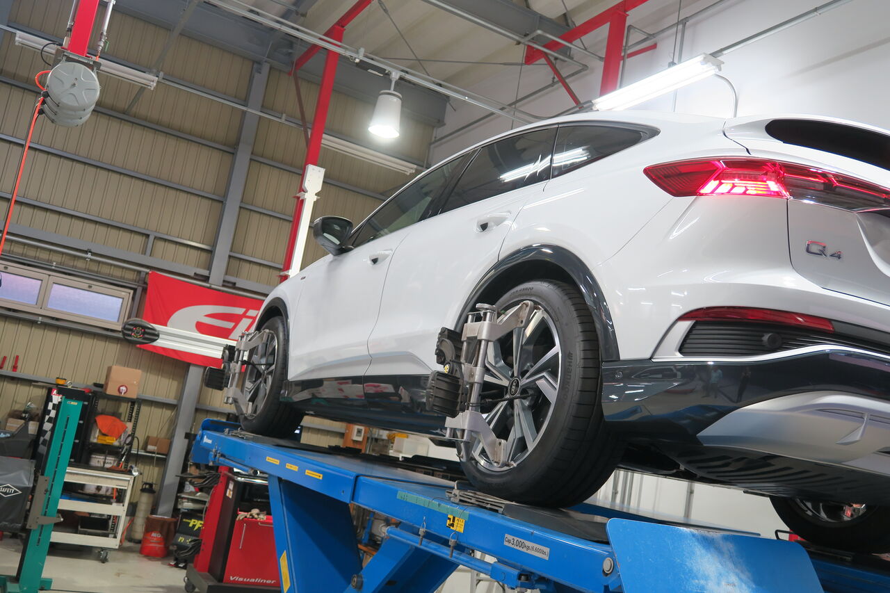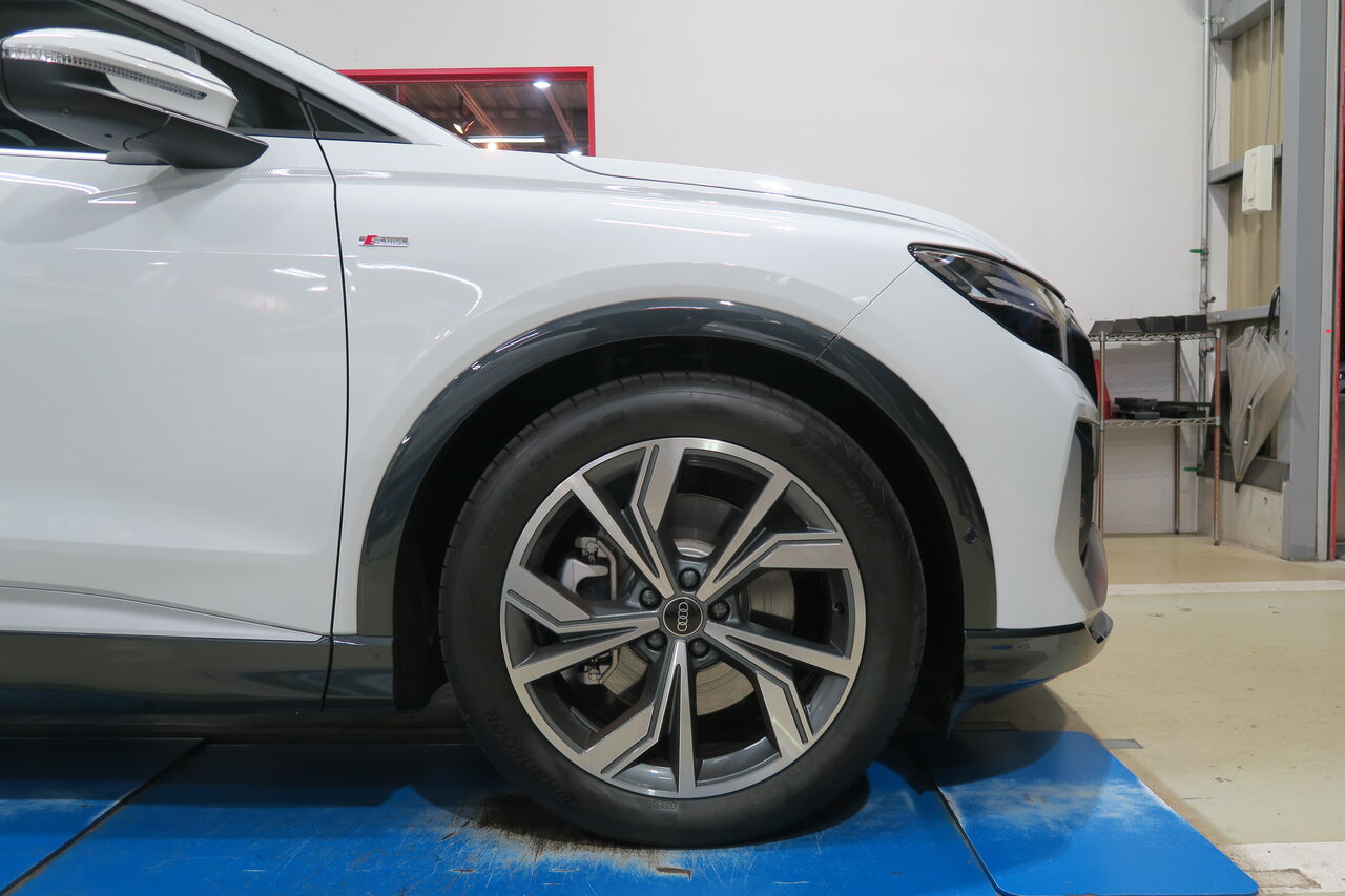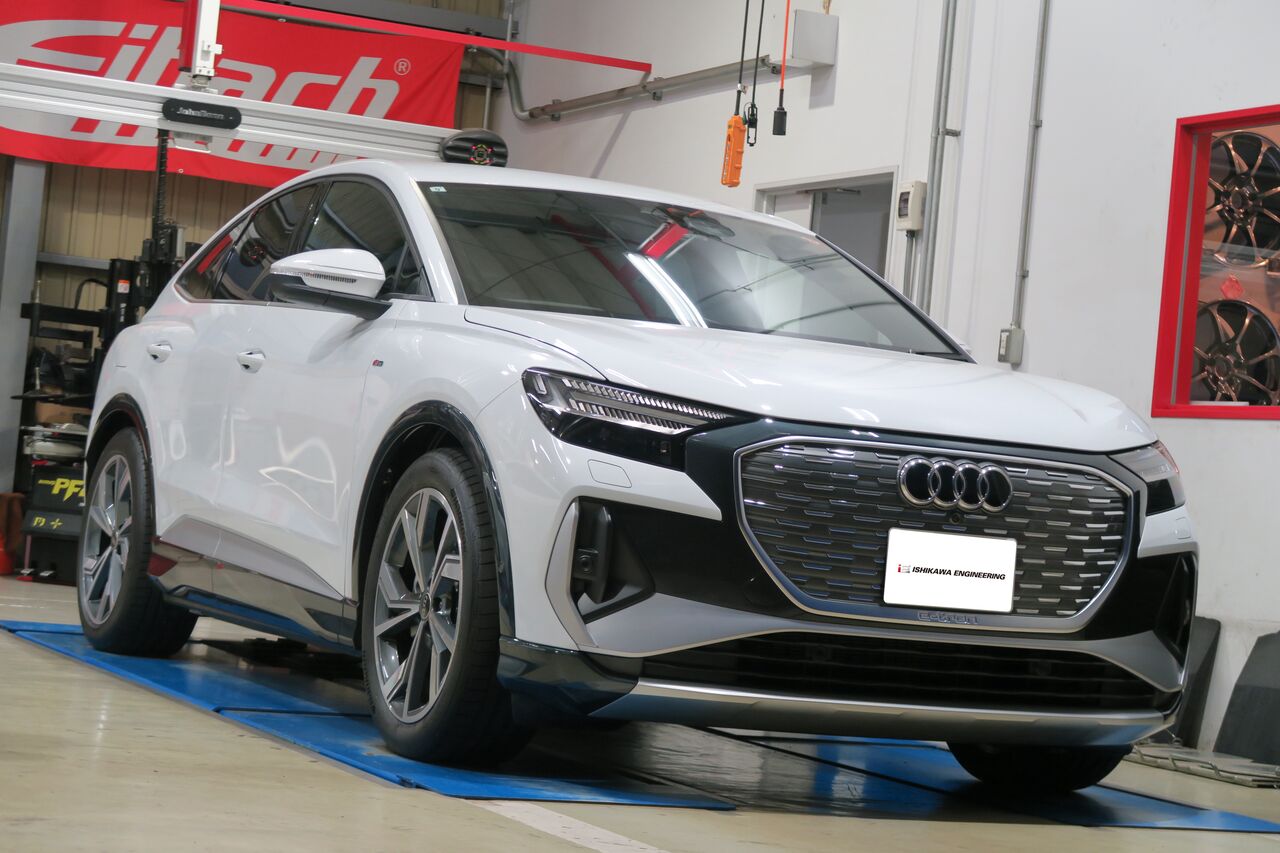 Q4 Sportback 40 e-tronのローダウンで「Eibach PRO-KIT」を装着させていただきました。標準グレードよりも車高が下がっているS-LineですがEibach PRO-KITの装着により純正比前後ともに約13ミリダウンとなりました。今回ローダウンに合わせてホイールスペーサーをフロント10ミリ、リア5ミリを装着してロー&ワイドなフォルムに仕上げました!ローダウンするだけでも車の印象は大きく変わりますが合わせてホイールの出面を合わせることでバランスの取れたフォルムになりますので気になる方はお気軽にお問い合わせください。