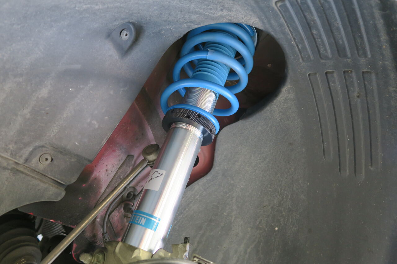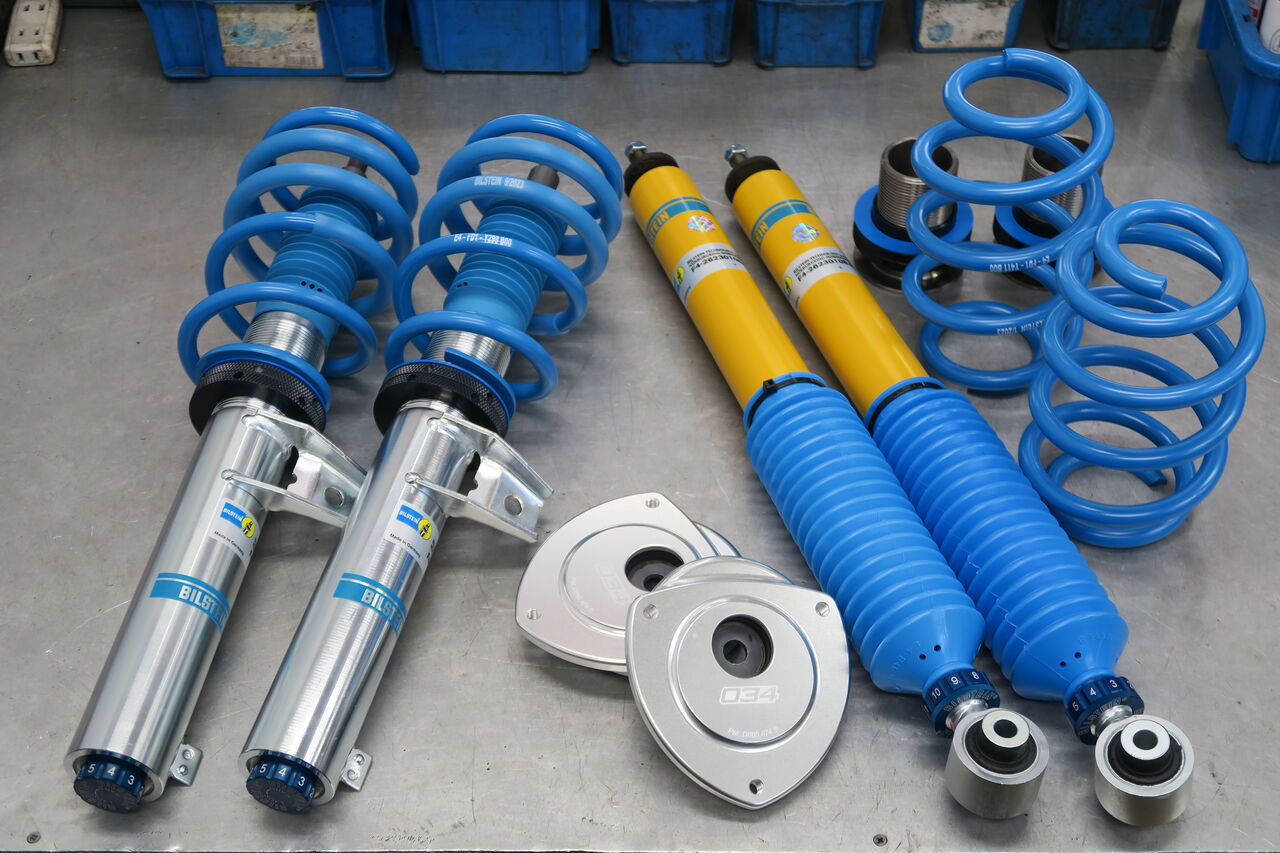 GOLF7 GTIの足回りアップグレードでお預かりしました。サスペンションは「BILSTEIN B16」に交換しました。減衰調整が可能なモデルとなりストリートからワインディング、サーキットまでしっかりと安定した走りを実現する車高調整式サスペンションキットです。ローダウンスプリングと異なり微細な車高調整が可能ですのでオーナー様の好みに合わせた車高調整が出来るのも大きな魅力です!今回同時に「034Motorsport ストラットキャンバーマウント」を装着しました。フロントキャンバー角は約-2.5度付近までネガティブ方向に変化させることができるため、ハミタイ対策のホイールの位置修正やスポーツ走行でのタイヤ接触面の修正など目的によっては便利なアイテムです!