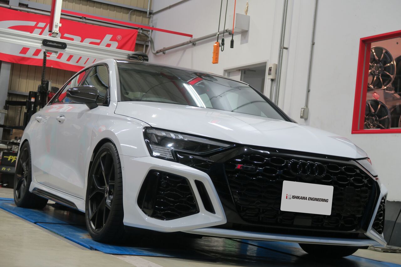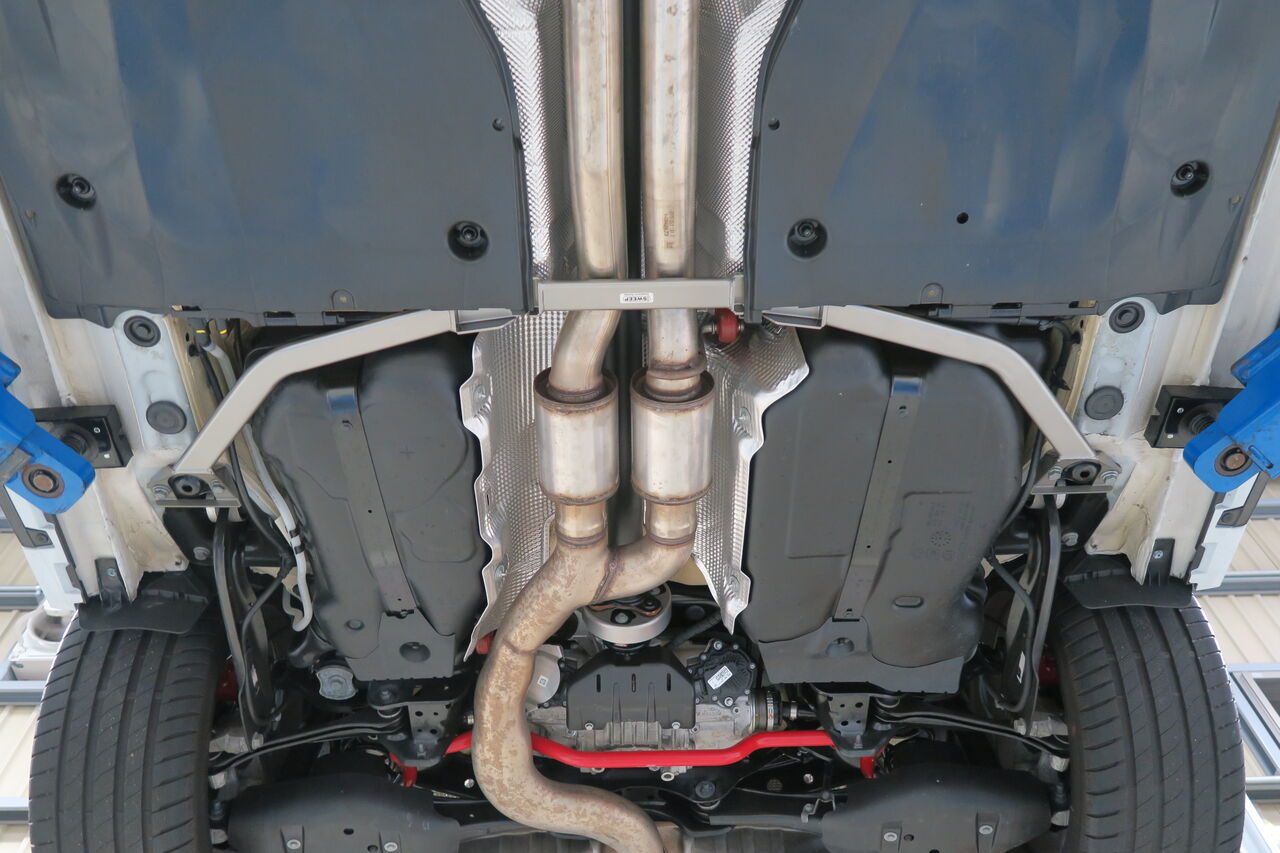 RS3(8Y)のブレーキパッド交換とボディ補強パーツの装着でご来店いただきました。ブレーキパッドは「iSWEEP IS3000」に交換しました。iSWEEP Brake Pad シリーズはIS1500~IS4000、IS耐久と幅広いラインナップを展開し目的やドライバーの好みに合わせたブレーキング特性を実現しますので気になる方はお気軽にお問い合わせください!今回同時にマフラー下のトンネル純正ブレースを取り外し本製品と入れ替えて、左右のエクステンションブレースはトレーリングアーム支持部のフレーム強化部分と接続することで飛躍的にボディのフロア剛性を向上させる「iSWEEP センターフロアパワーブレースリア3ピース」を装着しました。これにより路面のうねりや振動、衝撃をうけてもフロアがしっかりとすることでサスペンションが機能的に作用するようになりますので、乗り心地が向上し走行安定性も良くなります!