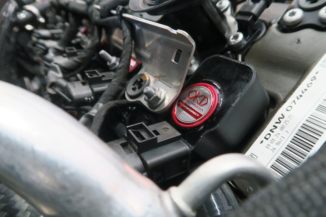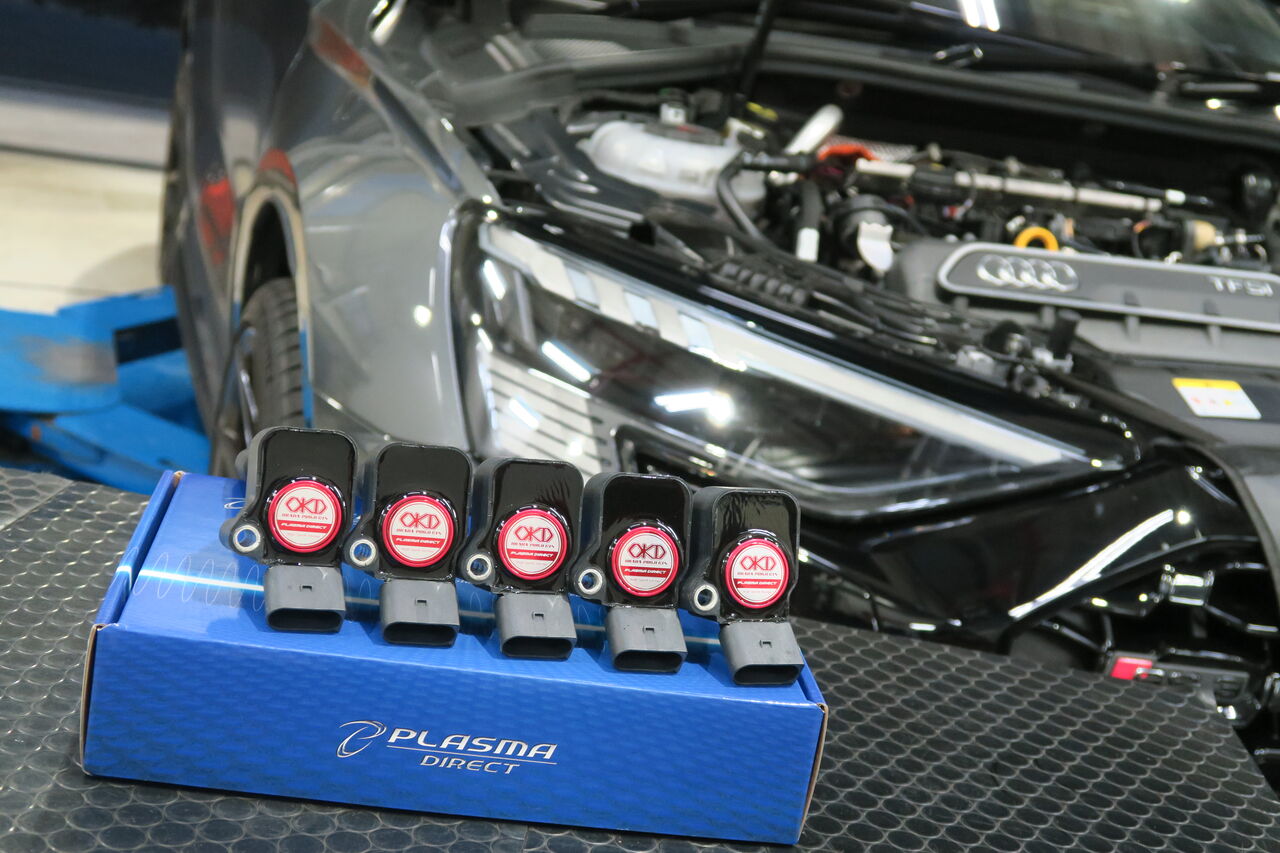そしてエンジン周りの吸排気にはエアクリーナーを純正からEVENTURI製インテークシステムに交換しました。ターボチャージャーに向けてスムーズな空気の流れを作ることでエンジンが持つポテンシャルを十分に発揮させることが可能になります。性能はもちろんですがカーボンファイバー製のインテークシステムがエンジンルームにインパクトをもたらします!ターボチャージャー入口のインレットパイプも交換させていただきました。マフラーは「REMUS Exhaust System」に交換することで排気効率はもちろん、ジェントルかつ上質なエキゾーストノートで場面を選ばずに心地よいサウンドをドライバーに届けます!イグニッションコイルは「OKADA PROJECTS PlasmaDirect」に交換。燃焼効率の向上によりトルクと出力アップ、レスポンスが向上し、安定した燃焼の効果により未燃焼ガスの排出を防ぎ完全燃焼を促すことで燃焼室内へのカーボン堆積を抑える効果もあります。そのためリフレッシュはもちろん新車の状態からの交換もオススメです!