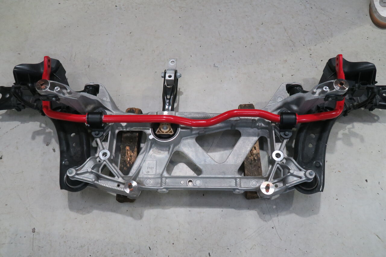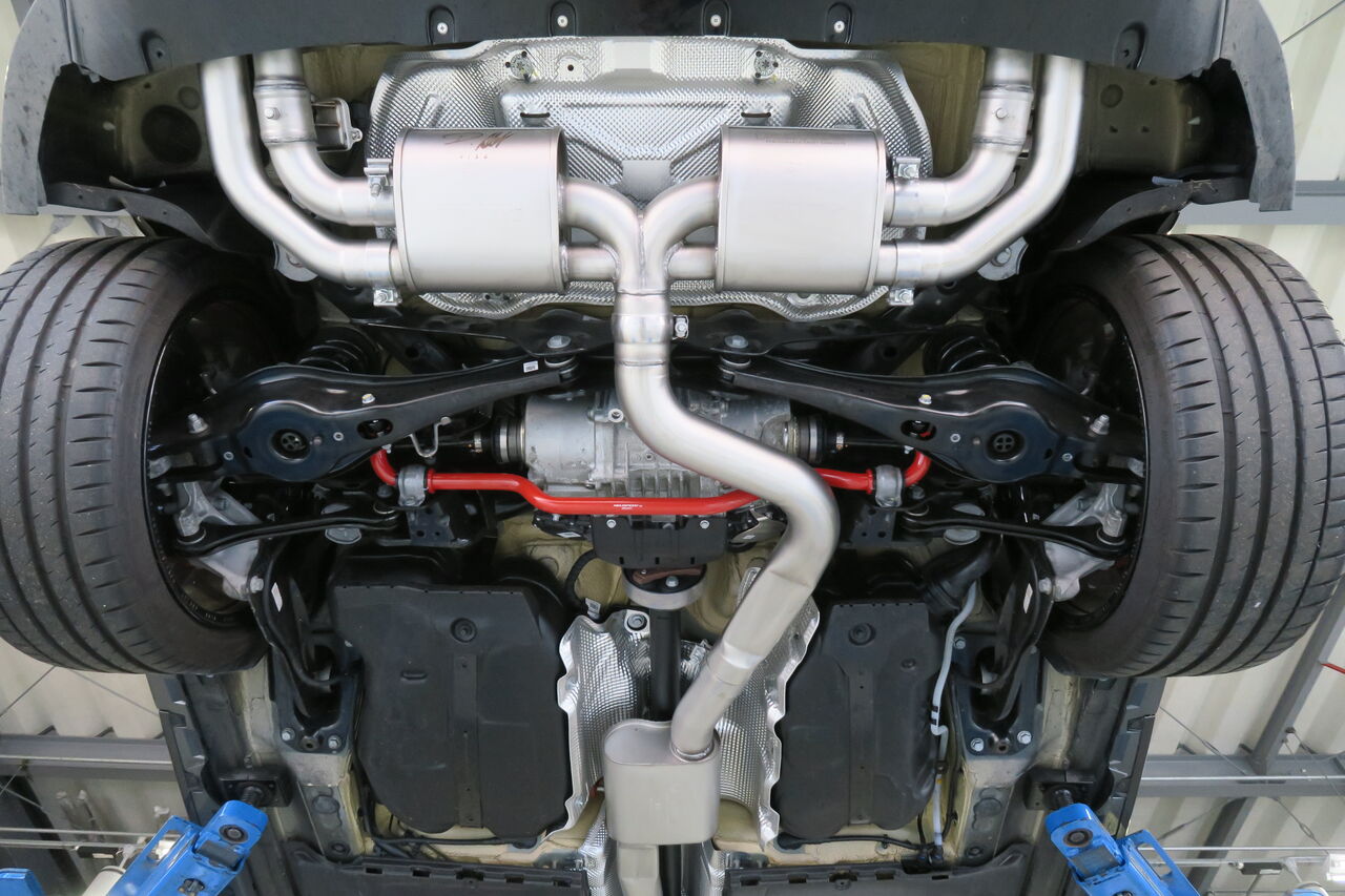 RS3(8Y)のトータルチューニングでお預かりしました。まず足回りではローダウンスプリング「NEUSPEED Sport Spring」を使用しました。車高の落ち幅は純正比で前後約20mmダウンとなりバランスのよいローフォルムになりました。不当ピッチのプログレッシブ特性のスプリングにより乗り心地としっかりとしたハンドリングの両立が可能です!さらに「NEUSPEED Sway-Bar & Sway-Bar Link」を前後に装着しました。不快なふらつきやロール、バタツキを大幅に減少させ、コーナリング時や高速走行時の走行安定性を格段に向上させます。Sway-Bar Linkを同時に交換することで早期にスタビライザーを機能させることができるためよりパフォーマンスを引き出すことが可能です!今回フロントサブフレームを外しての作業でしたので同時にiSWEEPサブフレームリジットカラーを装着しました。同時作業の場合、工賃を抑えてお得にチューンアップが出来ます!
