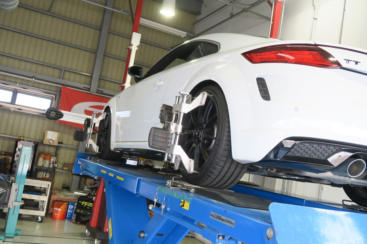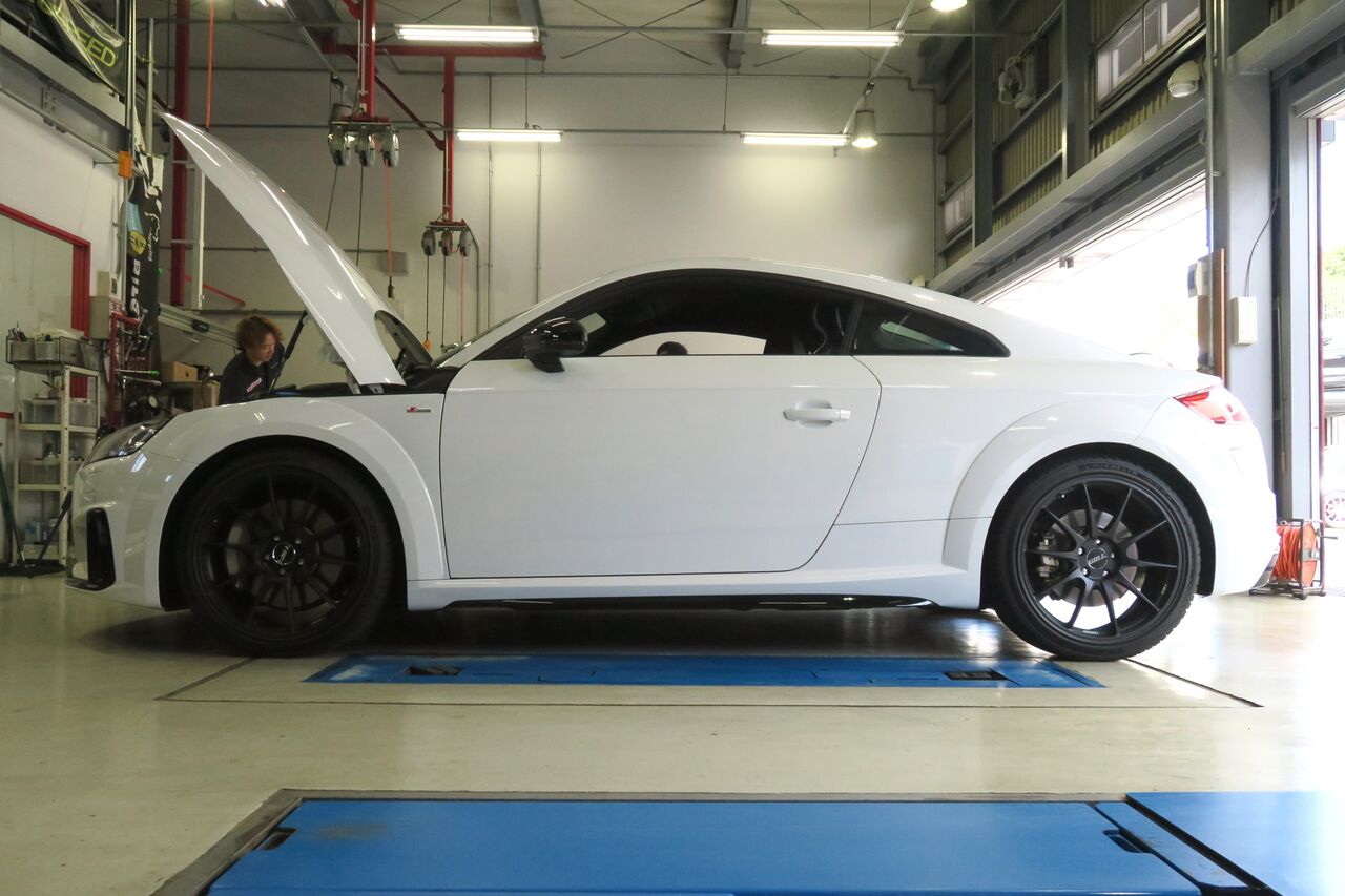 TT (8S) 2.0TFSI Quattroにローダウンスプリング「Eibach PRO-Kit」を装着させていただきました。純正の車高ですとフェンダーとホイールの隙間が大きく腰高な印象ですが、ローダウンにより程よく車高が下がることによってTTのスタイリッシュな印象がより強調されます!今回の落ち幅は純正比で前後約20ミリダウンとなりました。最後に4輪アライメント調整を行い完成です!