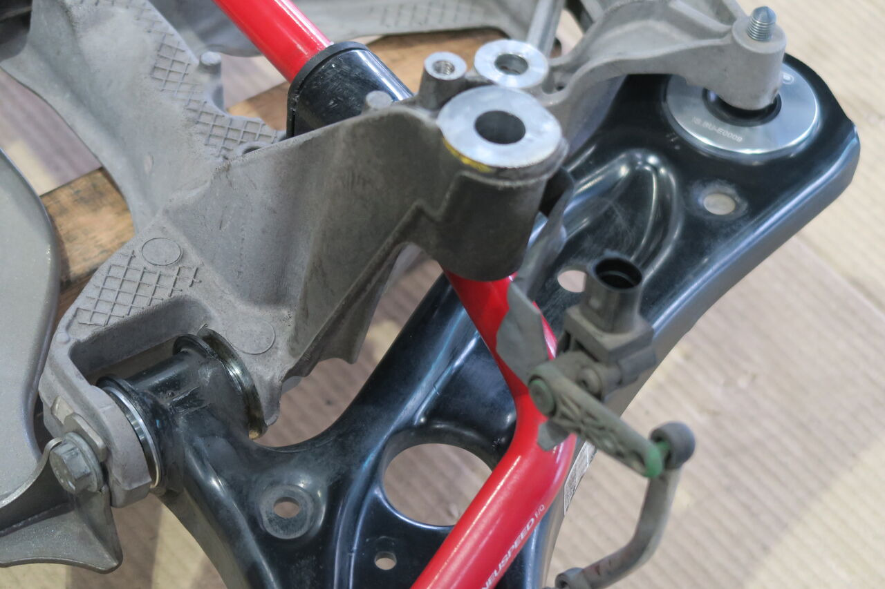 続いてサスペンションのアップデートです。今回はフロントサスペンションロアアームをピロブッシュ化させていただきました。純正のブッシュはゴムの伸縮性と弾力で保持&可動する仕組みですが、このゴムブッシュの弾力や変形は走行中にアライメント変化を発生させ、大きなストロークでは動きを阻害するためスポーツ走行においては好ましくありません。そこで今回はこのブッシュを金属製のピロボールに交換させていただきました。ロアアームの動きが上下方向のみに制限されることで加減速や操舵時のアライメント変化を無くし、安定かつダイレクトな走りをご体感いただけます。またストロークに対する抵抗が減少することで、サスペンションの動きがスムーズになり高い路面追従性を実現します。次回のサーキット走行で効果や違いを体感してください!