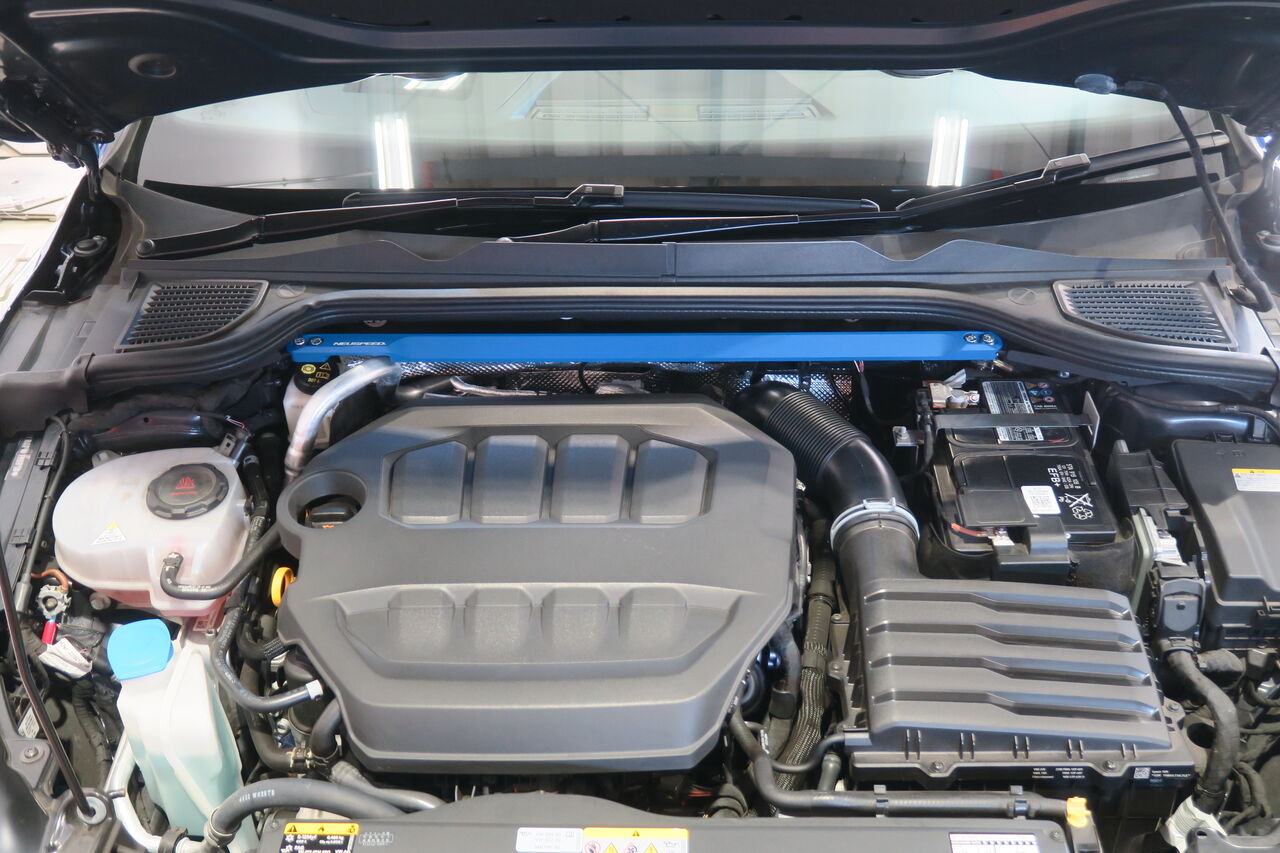 GOLF8 Rのボディ補強チューニング&エンジンオイル交換でご入庫いただきました。フロアは「iSWEEP Front Lower Arm Power Brace & Center Floor Power Brace〔Rear 3piece〕」の装着です。左右のロアアーム支点にブレースを追加することでハンドリングとトラクション性能の向上、センターフロアとリアサスペンションの支点を接続することで不規則なボディの変形を抑制します。ボディ剛性向上はサスペンションのリニアで正確な動作に直結し、安定感や乗り心地の改善に寄与します。エンジンルーム内のストラットタワーには、左右を接続する「NEUSPEED Front Upper Strut Tie-Bar」を装着です。お互いが支え合うように作用することでステアリング操作に対する応答性が上がり、よりスポーティーなハンドリングをお楽しみいただけます。