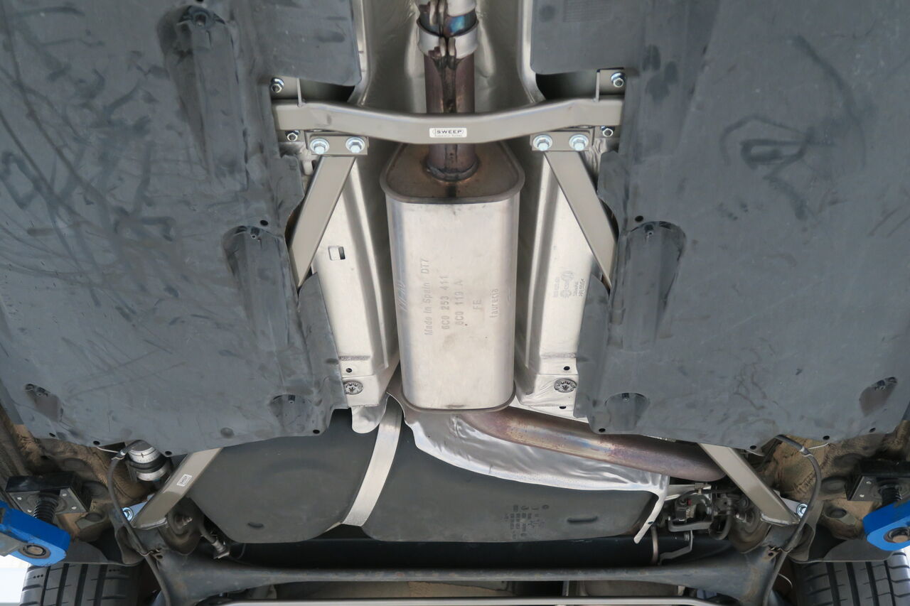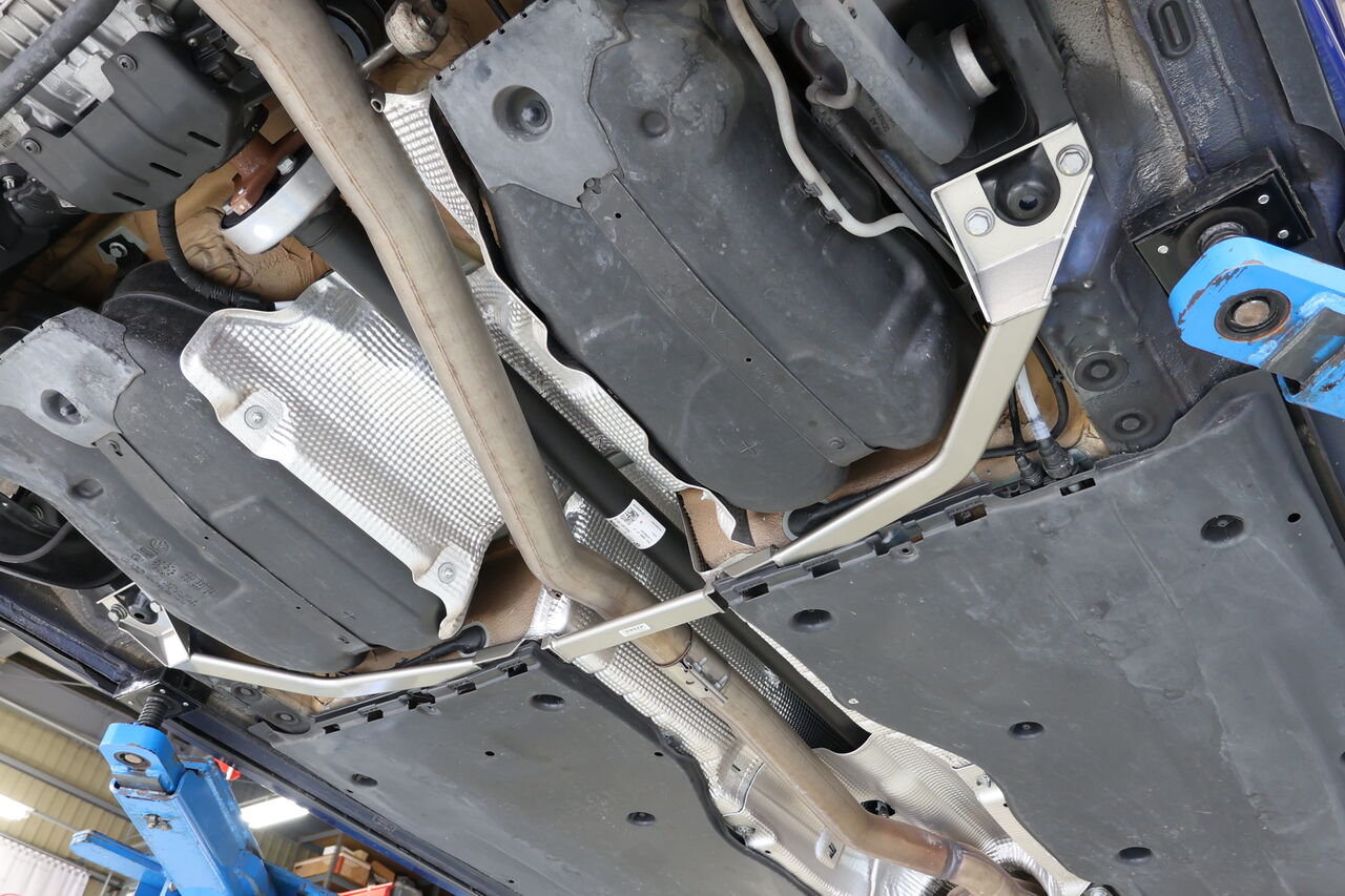 POLO (6C) Blue GTのボディ補強チューニングでご入庫いただきました。今回は「iSWEEP Center Floor Power Brace」のお取り付けです。純正のブレースと交換することでフロアのねじれ剛性を向上させます。iSWEEPのセンターブレースは追加で左右のリアサスペンション周辺の剛性を高めるエクステンションキットの装着も可能で、POLOのボディー最大のウィークポイントをカバーすることも可能です。