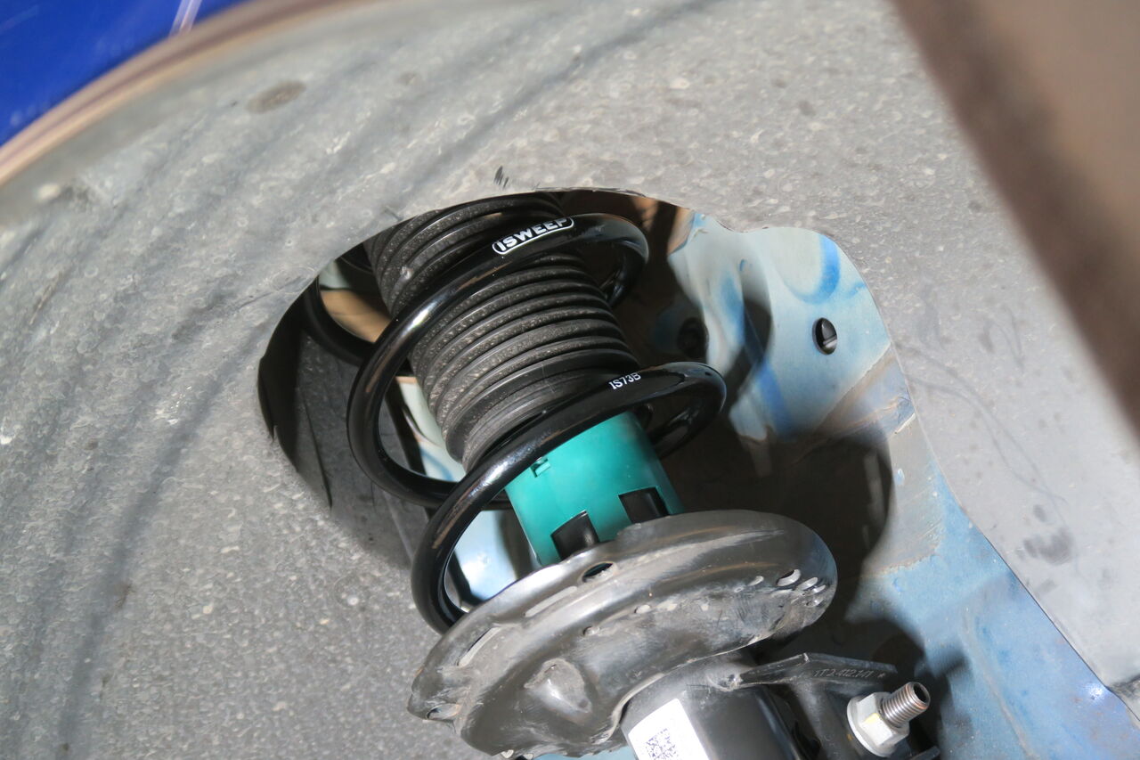 iSWEEP車高調整式サスペンションシステム「COMPETITION」の装着とフロア補強チューニングでお預かりしました。今回サスペンションはサーキット走行での更なるパフォーマンス向上を目的に仕様を決めさせていただきました。 フロントのキャンバー角を最大で-3.5°までサスペンションの脱着なしに調整可能で、カスタムメイドで自由にスプリングレートを設定できるサスペンションです。今回はフロントにHYPERCO 6インチ12.5K、リアにHYPERCO 8インチ9.8Kをセットアップしてフロントキャンバーを-2.5°に調整しました。