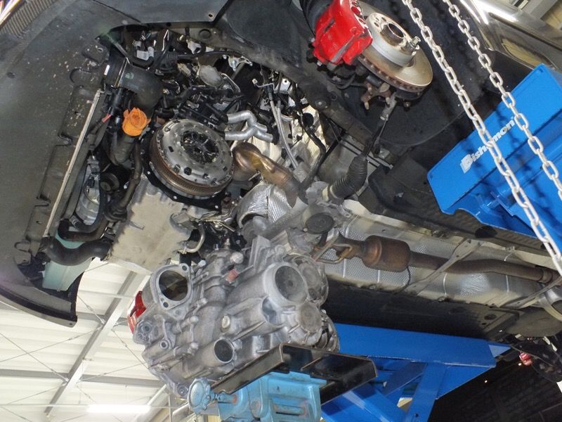 ギヤシフトできず走行不能にて入庫のS4 AVANT (B5)です。クラッチペダルを踏み込みギヤをシフトするとはじかれてしまい、ギヤの選択もできない状態なのでエンジンの動力が切れていないと判断しクラッチ廻りの点検となりました。トランスミッションを外しプレッシャープレート(動力を断続させる部品)を点検してみると内部にあるクラッチディスクを押さえつけているダイアフラムスプリングが変形しており、ペダル操作時にクラッチを断続させるだけのクリアランスがとれずクラッチがきれずにいたようです。原因はプレッシャープレートと断定されたのでクラッチ廻り一式交換にて修理完了となりました。
