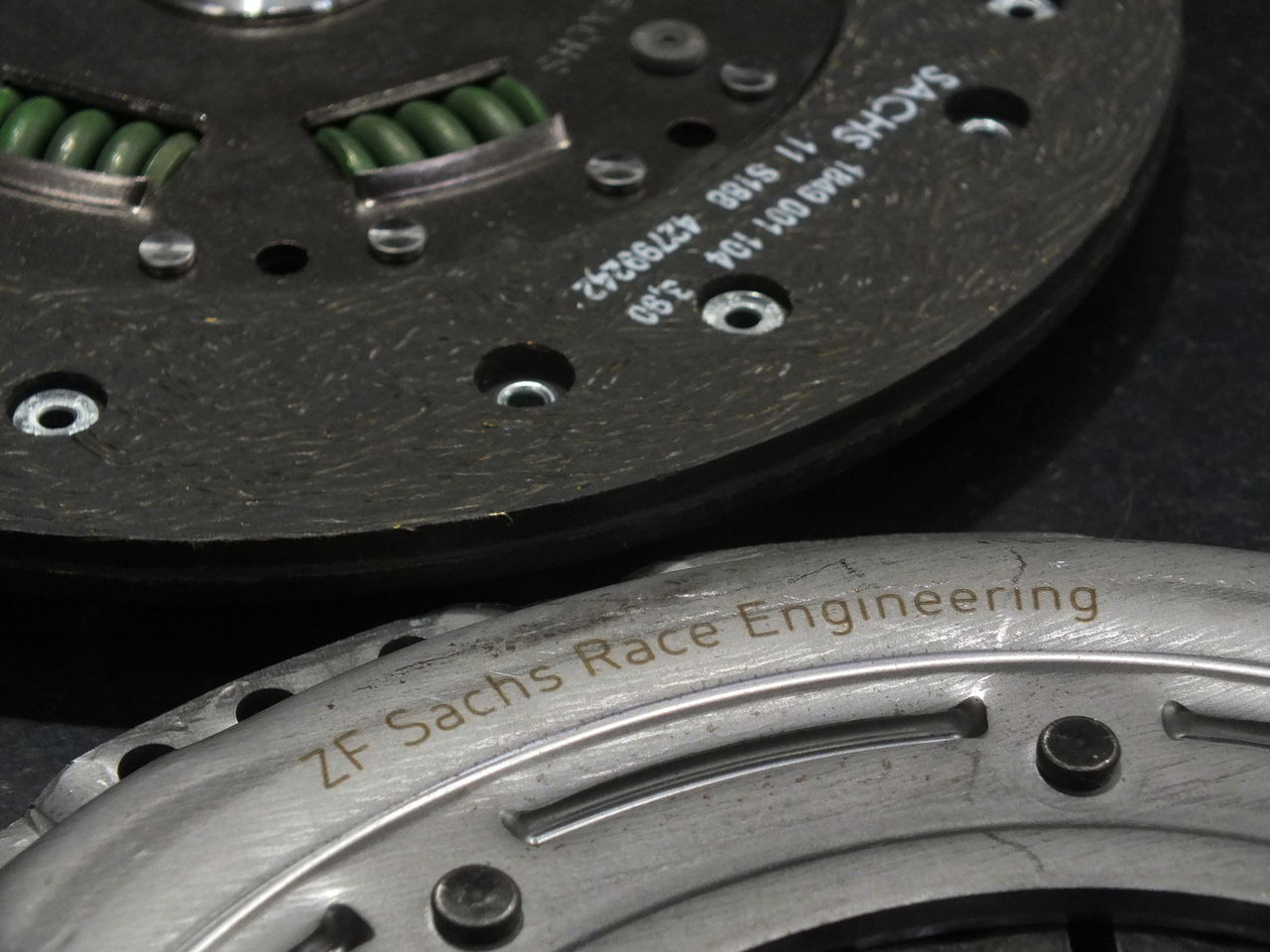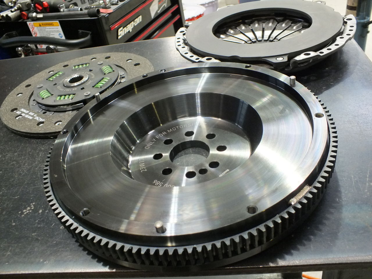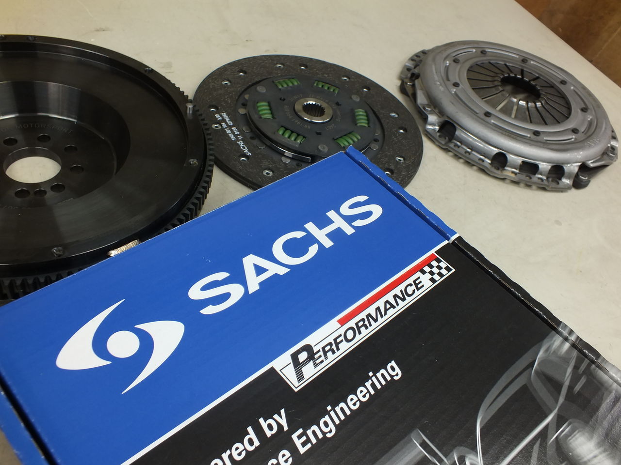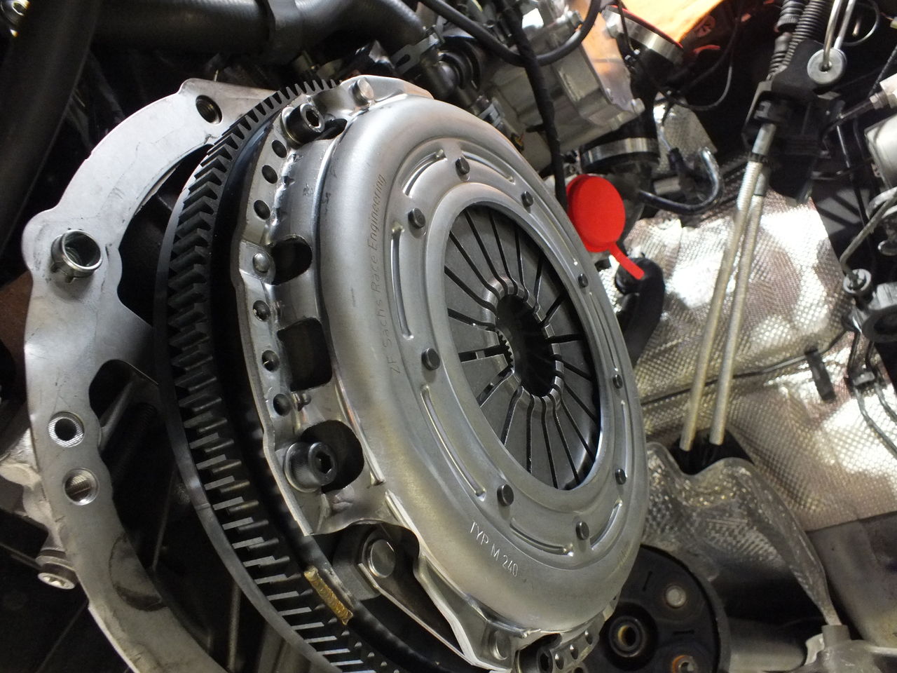 連続になりますが、SACHS Performance Clutch Systemを組込み駆動系の強化を図りました。このシステムは、専用シングルマスタイプの軽量フライホイールとクラッチディスク(オーガニックタイプ)、強化プレッシャープレート、専用レリーズベアリングで構成されています。