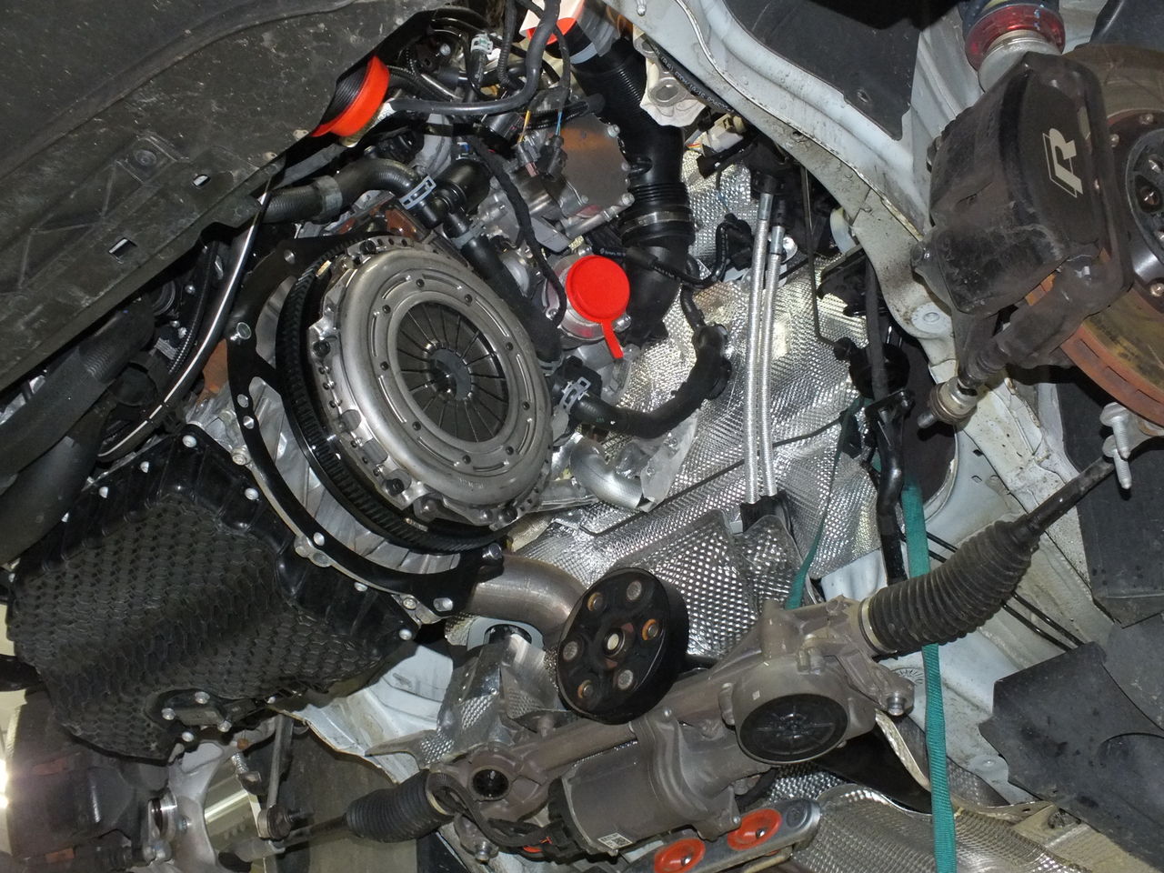 GOLF7 Rのメンテナンス&アップグレードでお預かりしました。クラッチが「滑る」現象が出ていたため「SACHS Performance 強化クラッチキット」を装着させていただきました。純正クラッチの許容トルクが低いためECUの書き換えなどでパワーを上げるとクラッチの寿命が短くなったり滑りなどの現象が出てきます。今回装着したクラッチは許容トルクが高くなっており、強化されたクラッチカバーと専用の軽量フライホイールを使用します。フライホイールはシングルマスタイプになるため、エンジントルクの伝達ロスが少なくエンジンレスポンスもアップします。サブフレームの脱着に合わせて「iSWEEPサブフレームリジットカラー」を取り付けました。