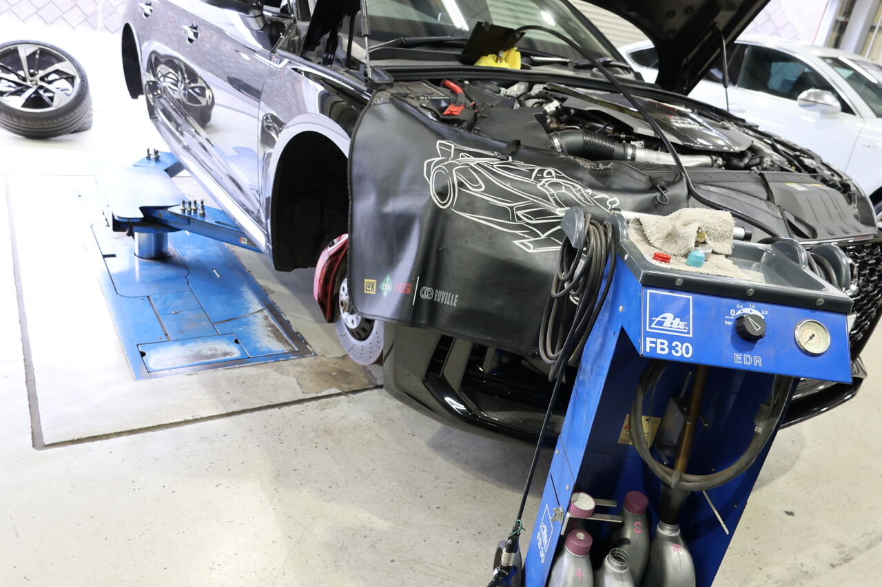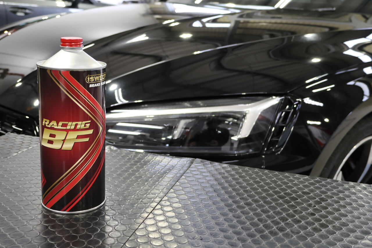 RS5(B9)のブレーキフルード交換でご来店いただきました。ブレーキフルードは耐熱性の高い「iSWEEP RACING BF」を使用しました。サーキット走行などでハードなブレーキングを連続して行うと高温に晒されたフルード内に気泡が生じてブレーキ性能が大幅に低下するベーパーロック現象の発生リスクが高まります。そのため、安全にサーキット走行を楽しむにはブレーキフルードのグレードアップが重要となります!