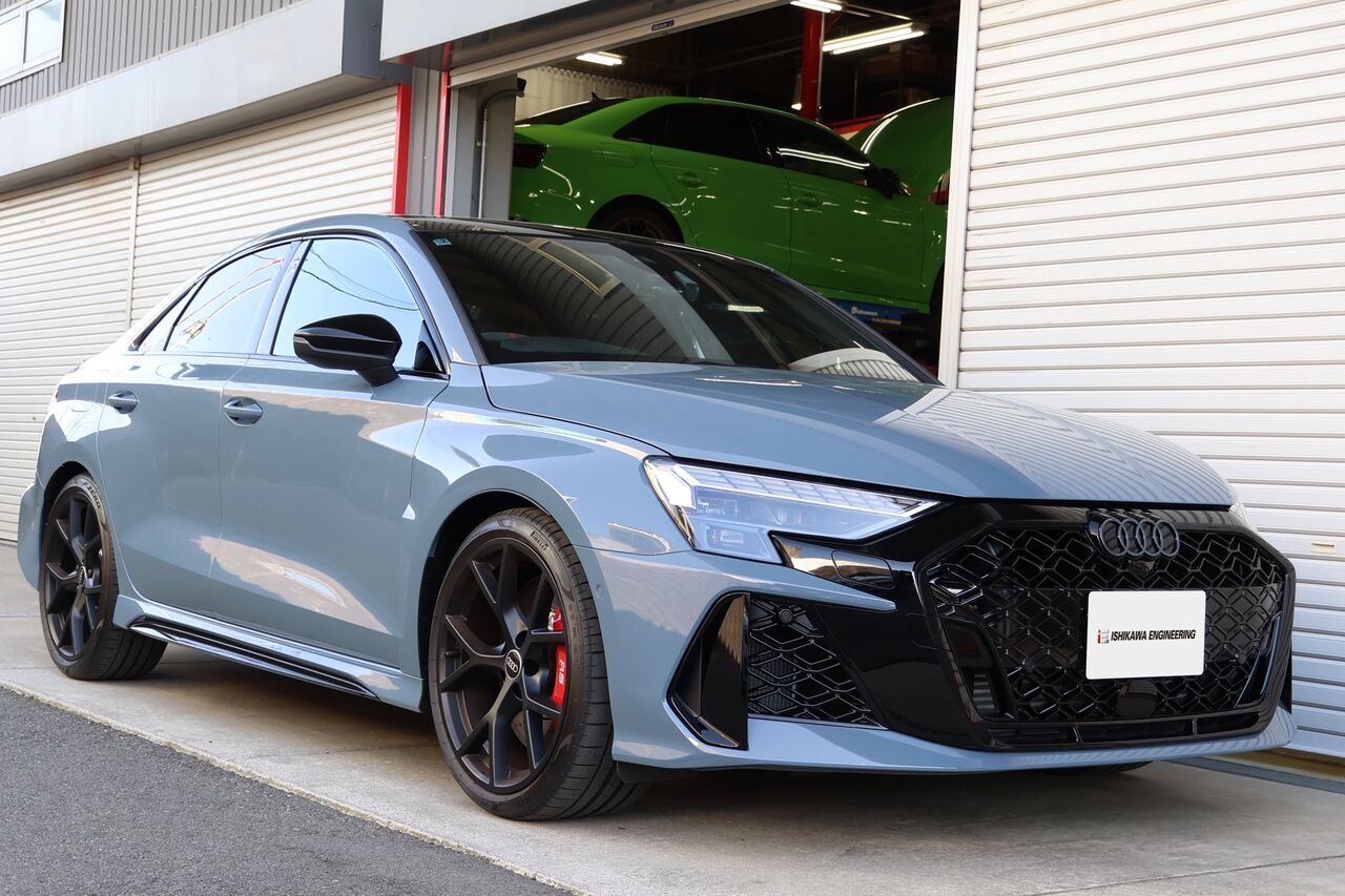 RS3(8.5Y) Sedanのフロントブレーキパッド・タイヤ交換でご来店いただきました。サーキット走行を楽しまれているこちらのお客様には「iSWEEP IS3500」をお選びいただいております。IS3500は耐熱性や最短距離で減速する制動力はもちろんブレーキング時の細かなコントロール性にも高いご評価をいただき多くのサーキットユーザー様からのご愛顧をいただいております。タイヤには「PIRELLI P ZERO」をお選びいただきました。ドライ路面での性能はもちろんウエット路面でも安心してご使用いただけるため幅広いシチュエーションで活躍します!