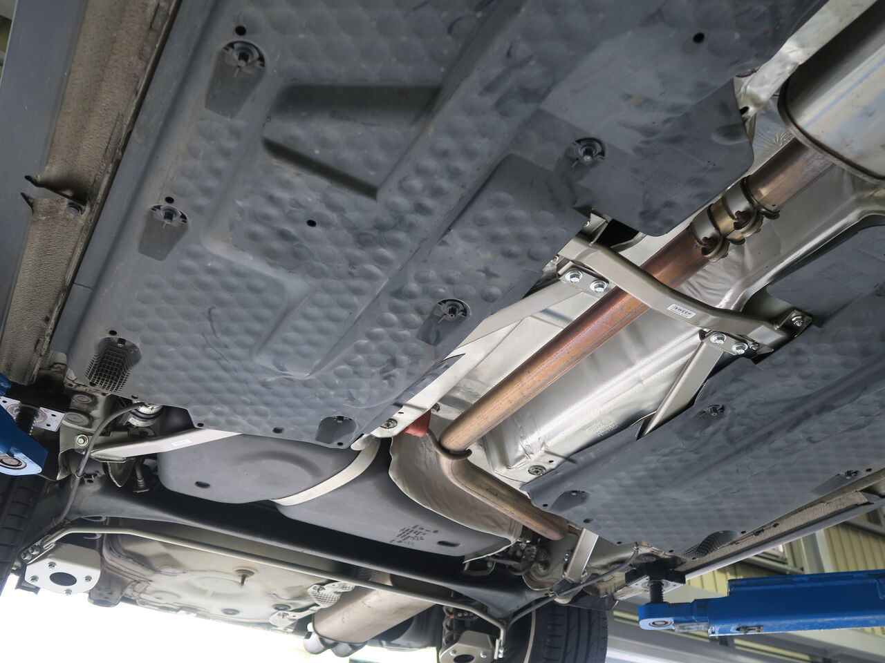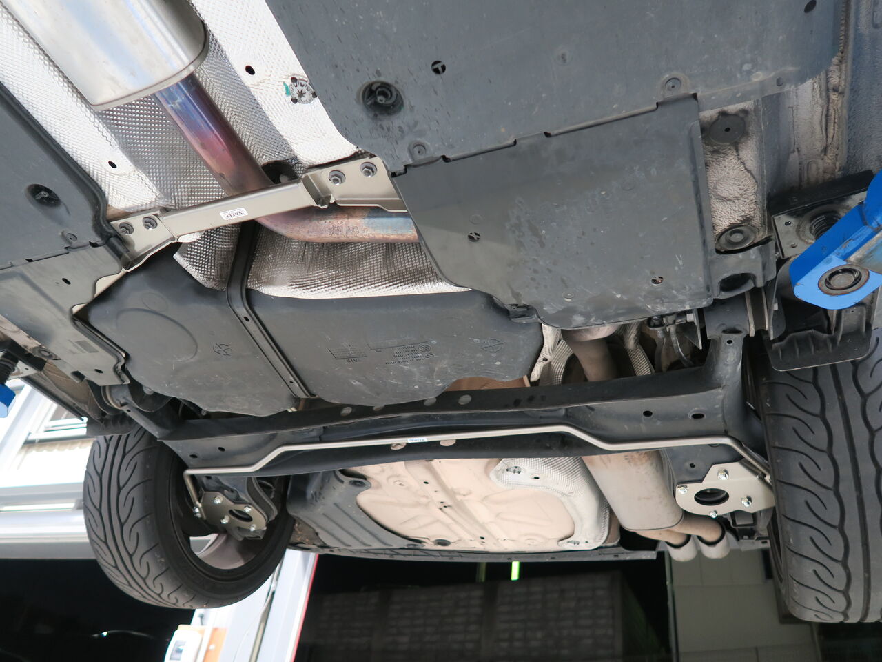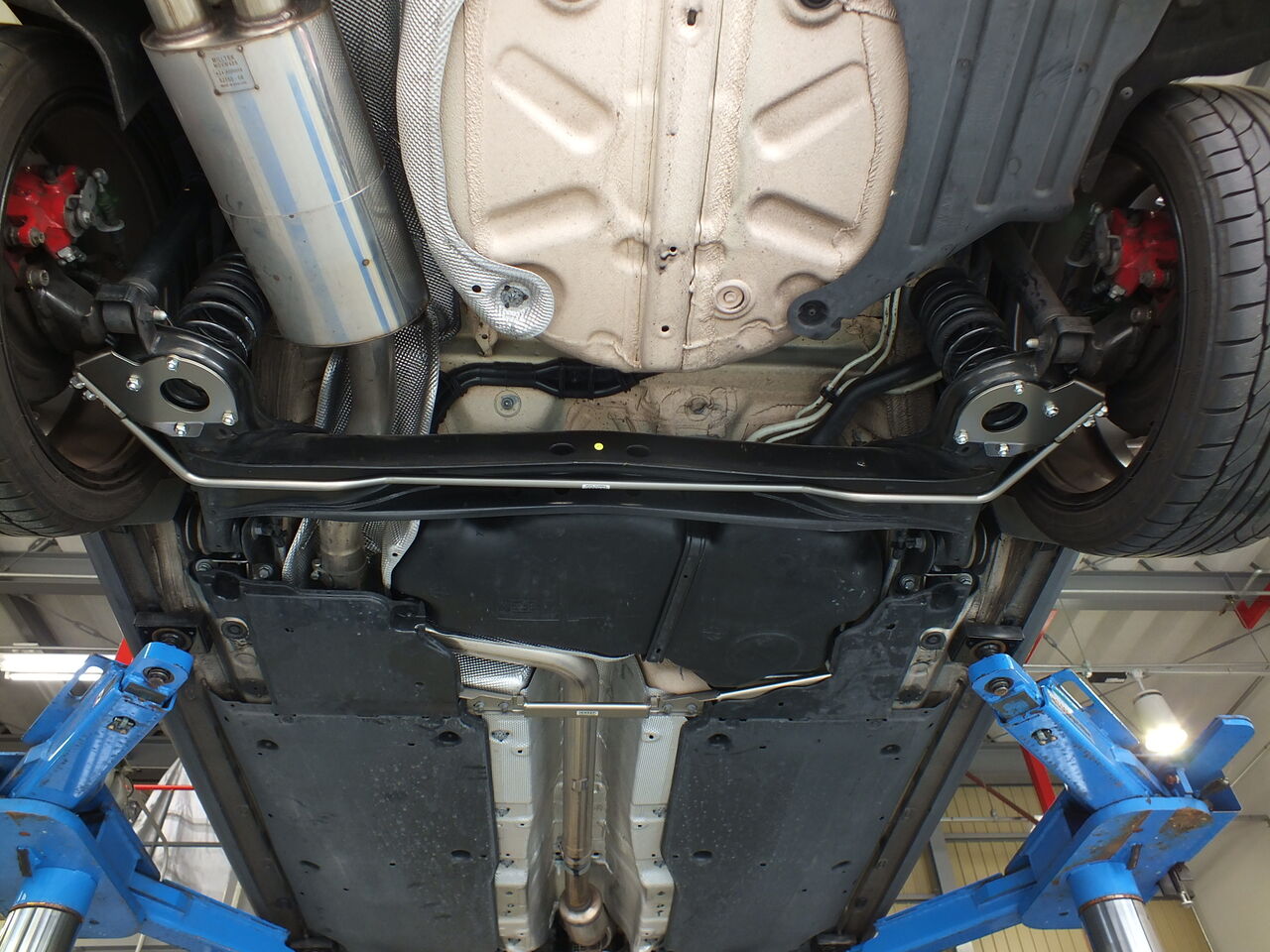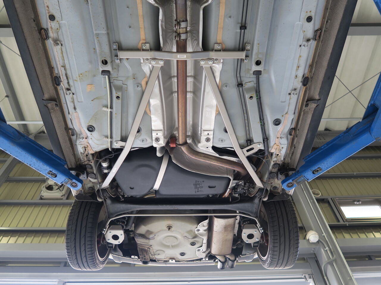 純正状態ではホイールが内側に窪み過ぎている!とのことでホイールスペーサーを装着させて頂きました。装着させて頂いた厚みはフロント5mmとリア10mm。今後ローダウンするということもあり、少し張り切った厚みですね!そして追加で頂きました作業はセンターフロアブレース(リア)の装着です。車両によりアンダーカバーと干渉することがありますが、当社ではお互いに居心地がいいように最低限の加工をアンダーカバーに施しまして装着しております!
