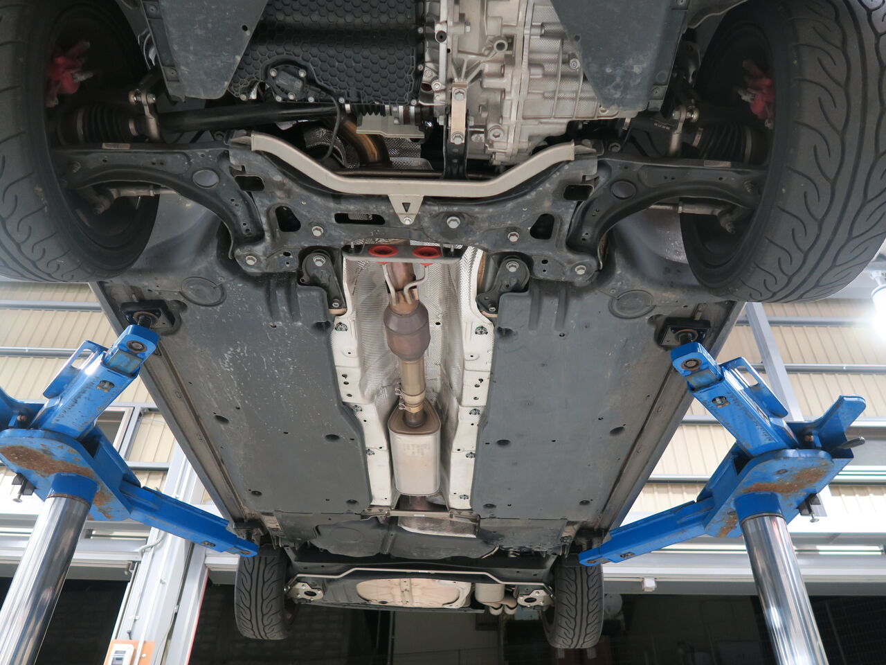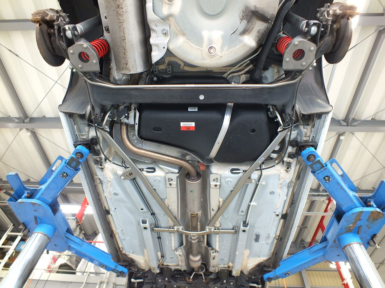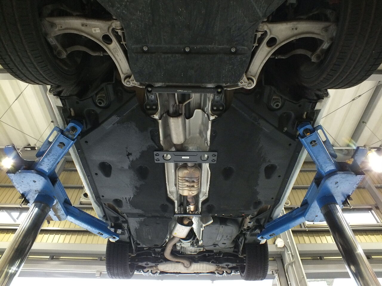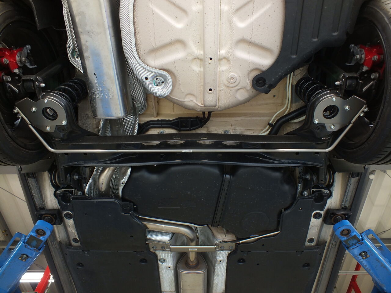純正状態ではホイールが内側に窪み過ぎている!とのことでホイールスペーサーを装着させて頂きました。装着させて頂いた厚みはフロント5mmとリア10mm。今後ローダウンするということもあり、少し張り切った厚みですね!そして追加で頂きました作業はセンターフロアブレース(リア)の装着です。車両によりアンダーカバーと干渉することがありますが、当社ではお互いに居心地がいいように最低限の加工をアンダーカバーに施しまして装着しております!
