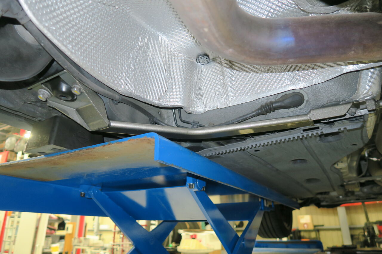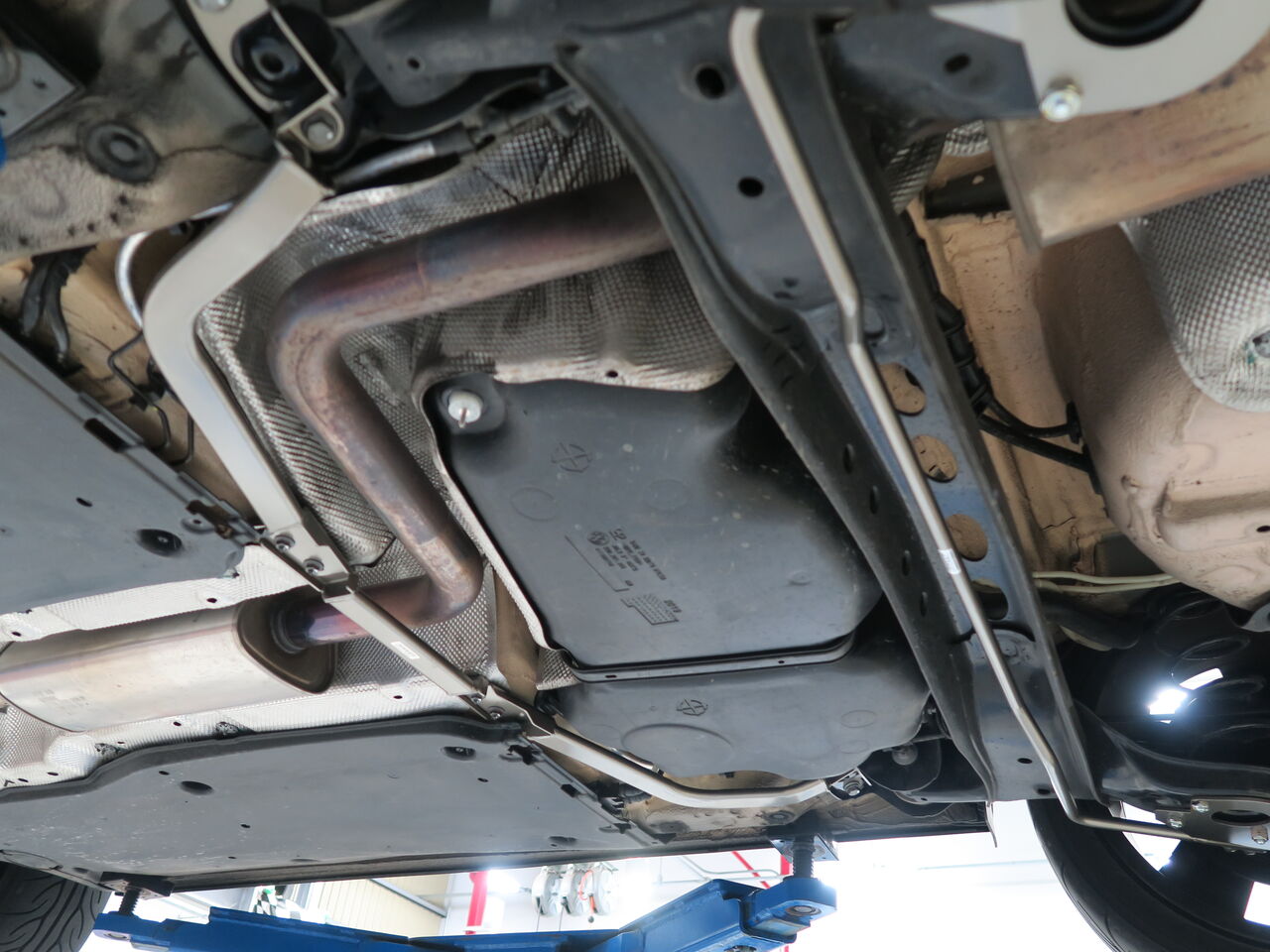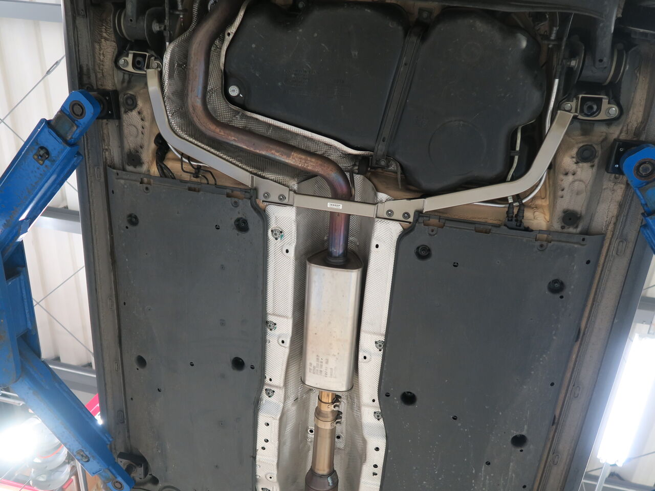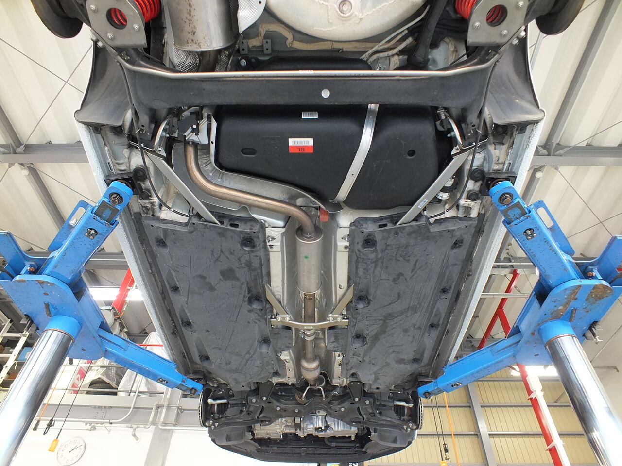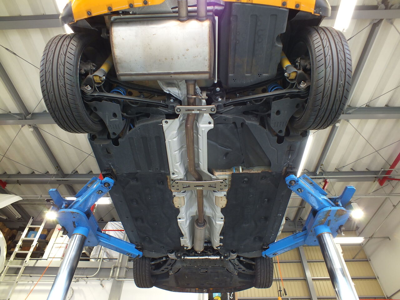 純正状態ではホイールが内側に窪み過ぎている!とのことでホイールスペーサーを装着させて頂きました。装着させて頂いた厚みはフロント5mmとリア10mm。今後ローダウンするということもあり、少し張り切った厚みですね!そして追加で頂きました作業はセンターフロアブレース(リア)の装着です。車両によりアンダーカバーと干渉することがありますが、当社ではお互いに居心地がいいように最低限の加工をアンダーカバーに施しまして装着しております!