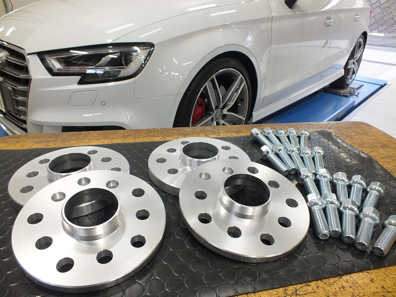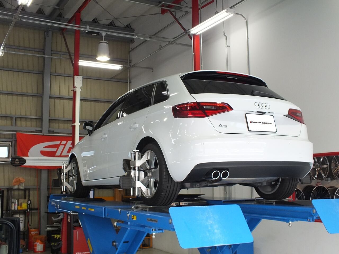 愛車のAUDI S3を好みの見た目に整えるのと合わせて、シャーシ補強を行い乗り心地の改善をしたい、とご相談を頂きました。使用過程において左右の車高差が出はじめた際などにも対処がしたいということから、車高の微調整が可能なKW ハイトアジャストスプリング(HAS)を使用しました。ダウン幅はフロント約15mm、リア約10mm。そしてホイールスペーサーはフロントに10mm、リアに15mmを装着しました。シャーシ補強はセンターフロアブレースリア3ピースをお取付けしました。