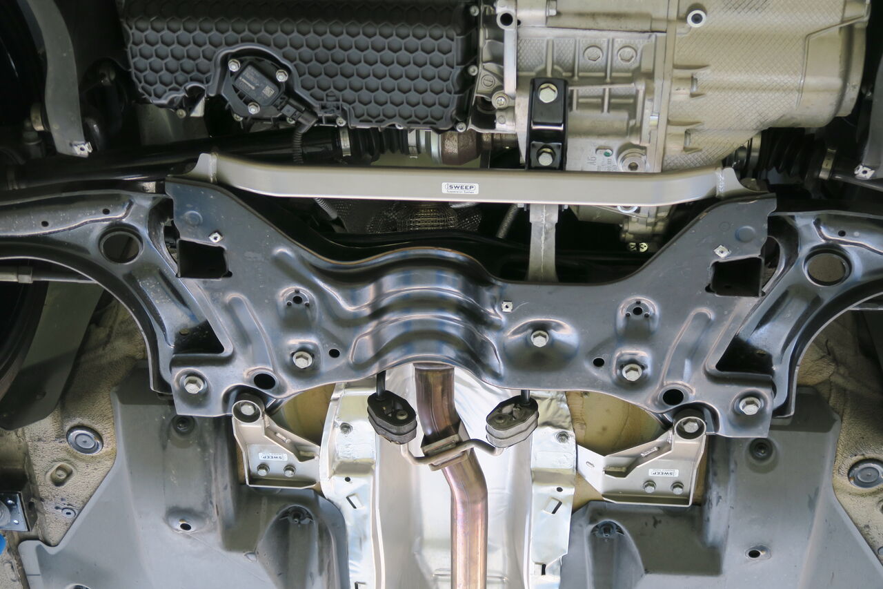 気持ちよくコーナーを曲がりたいのでホイールスペーサーの装着を検討中とのことでご来店いただきました。詳しくお話を聞いてみますと車体の挙動とロールに不快を感じられているご様子でしたので、ホイールスペーサーでは改善しない旨ご説明させていただいたうえで、走行中の挙動を安定させるiSWEEPセンターフロアブレースリア3ピースをお勧めして装着いただきました。走りの挙動はいかがでしょうか。