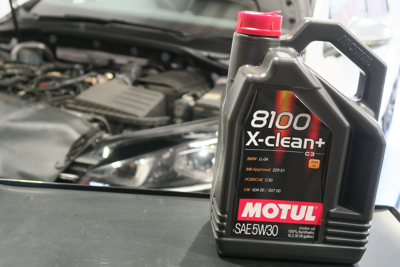 今回の点検では特に不具合は見つからず、エンジンオイルとオイルフィルターの定期交換のみ実施しました。使用したオイルは MOTUL 8100 X-Clean+ 5W30 です。