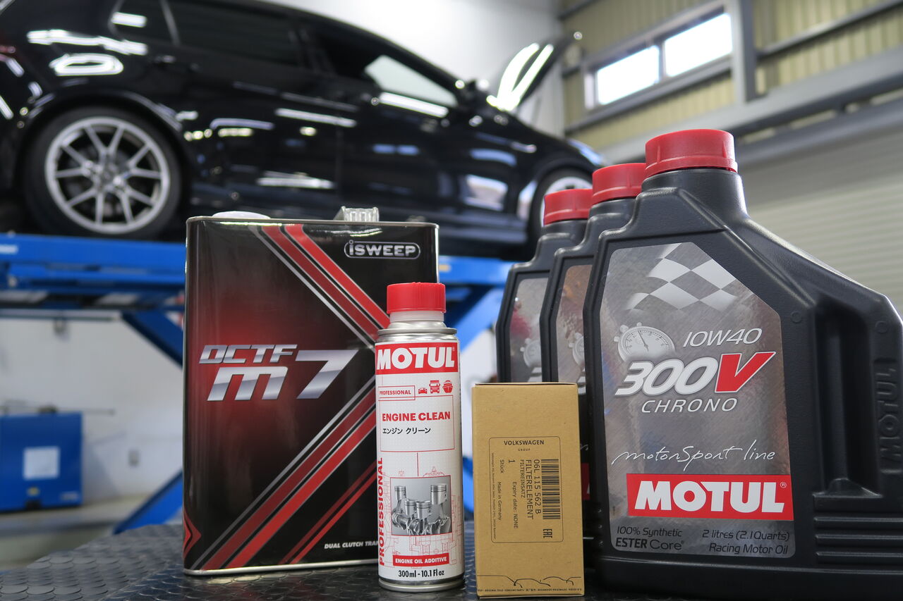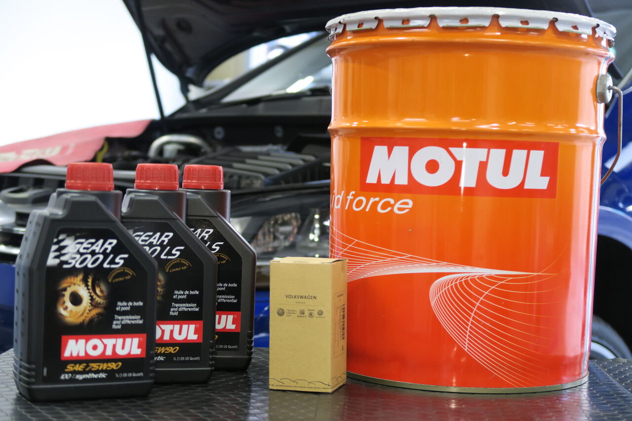 GOLF7.5 GTIの油脂類メンテナンスでご入庫です。6MT搭載のこちらの車両にはギアオイルに「MOTUL GEAR 300 LS」を使用させていただきました。MT車の場合ギアオイルの性能はシフトフィーリングにも大きく影響するため気持ちの良いドライビングのためには欠かせないメンテナンスですね。同時にエンジンオイル、そしてブレーキとクラッチのフルードをリフレッシュさせていただきました。性能の維持や操作性はもちろん、なにより安全なドライブをお楽しみいただくため定期的な油脂メンテナンスは非常に重要です。