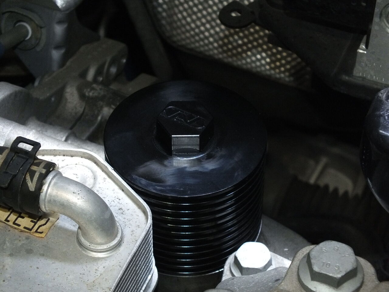 DSGオイル交換を行いました。使用したDSGオイルはiSWEEP DCTF m7です。DSGオイルフィルター交換に合わせてNEUSPEED アルミビレットオイルフィルターハウジングに交換しました。冷却フィンを持つオイルフィルターハウジングによって高い放熱性を発揮しDSGオイルの油温を安定させる効果があります。