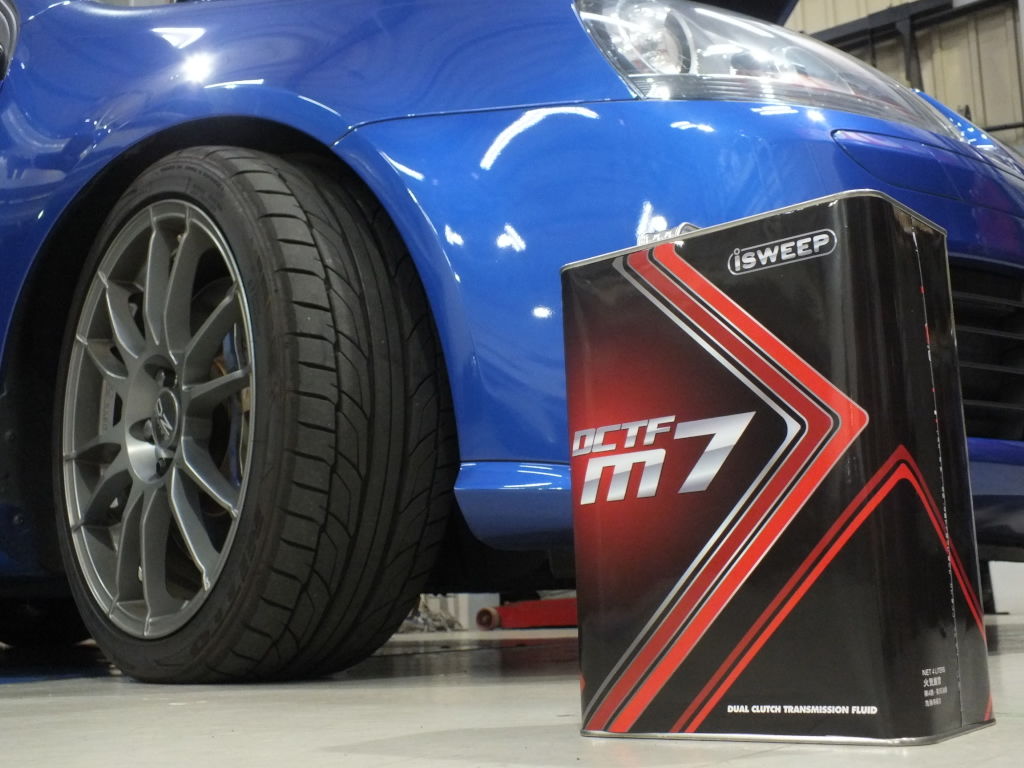 GOLF7.5R 7速DSGのオイル交換を行いました。使用したDSGオイルはiSWEEP DCTF m7です。純正DSGオイルよりもミッションの保護性能に優れ、伝達ロスを防ぎスムースな加速と変速を実現します。