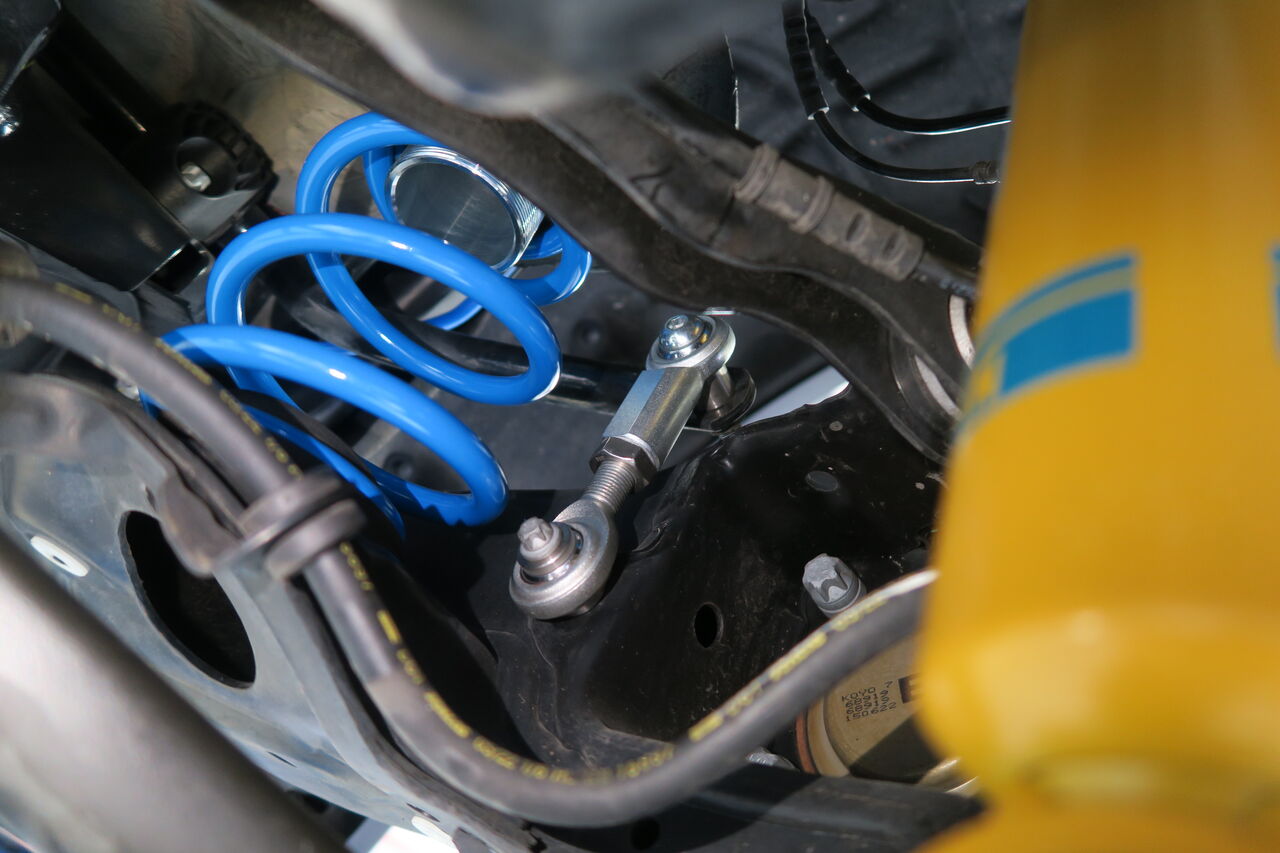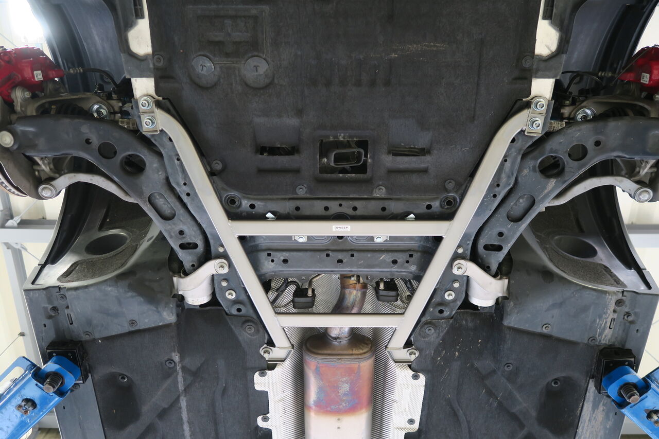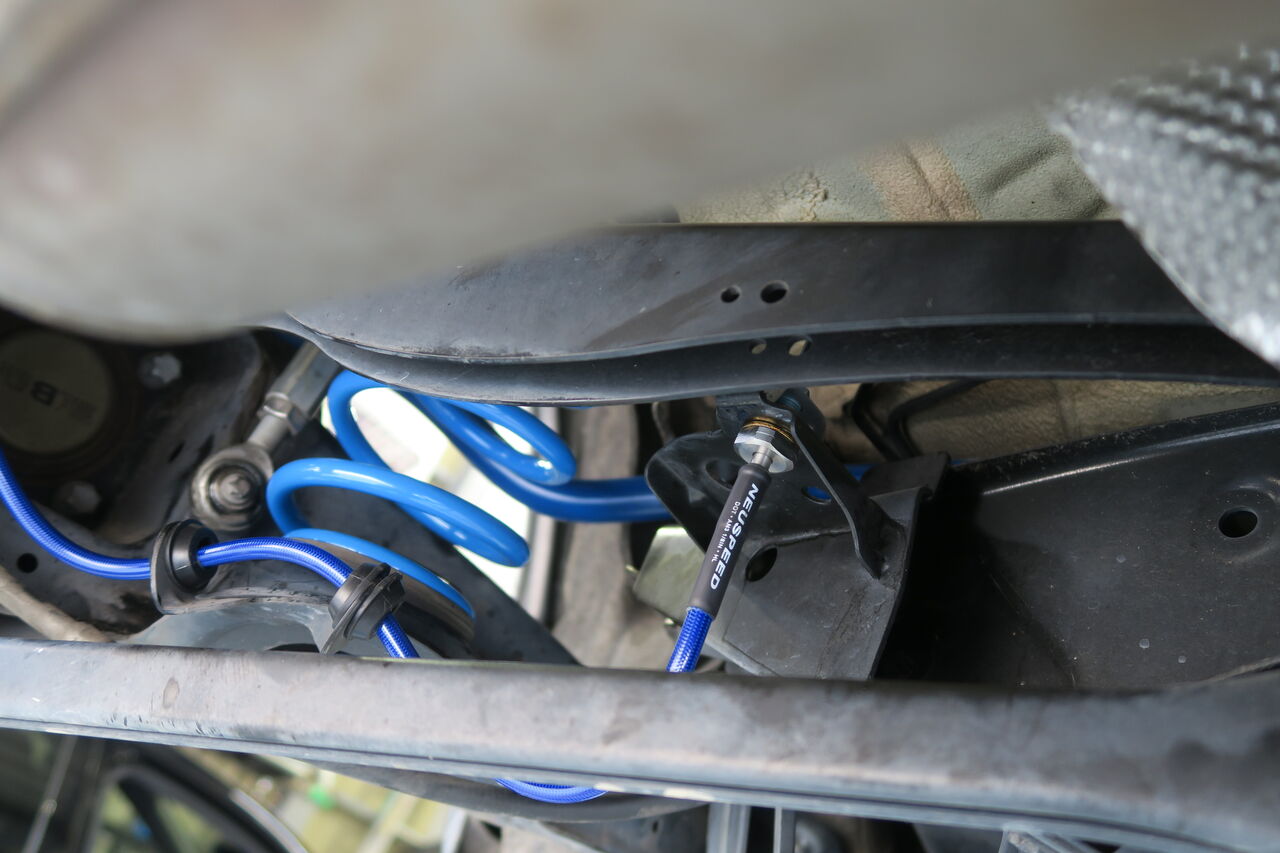サスペンションアップグレードに合わせてボディ補強としてパワーブレースを3点装着させていただきました。フロントメンバーの捻じれや歪を抑制する「フロントメンバーブレース」、純正スチールプレス製ブレースと交換することで、ボディのフロア剛性を向上させる「センターフロアブレース」、リアサブフレームのコントロールアーム保持部分の剛性強化により、スポーツ走行時やコーナリング時の挙動を安定させる「リアメンバーブレース」の3点を装着しました。iSWEEPボディ補強パーツは、それぞれ取付後の目的を持って設計されていますので、装着すればその違いをきっとご体感頂けます!併せてサブフレームとボディの締結力を高め、正確なハンドリングや快適性を阻害する走行中の“ズレ”を抑制する「iSWEEP Sub-Frame Rigid Collar」とリアスタビライザーリンクを「NM Engineering Rear Adjustable Sway Bar Link」に交換しました。純正のゴムブッシュタイプから高強度のボールジョイントタイプになることでスタビライザーの効果をロスなく発揮させることが出来ます!