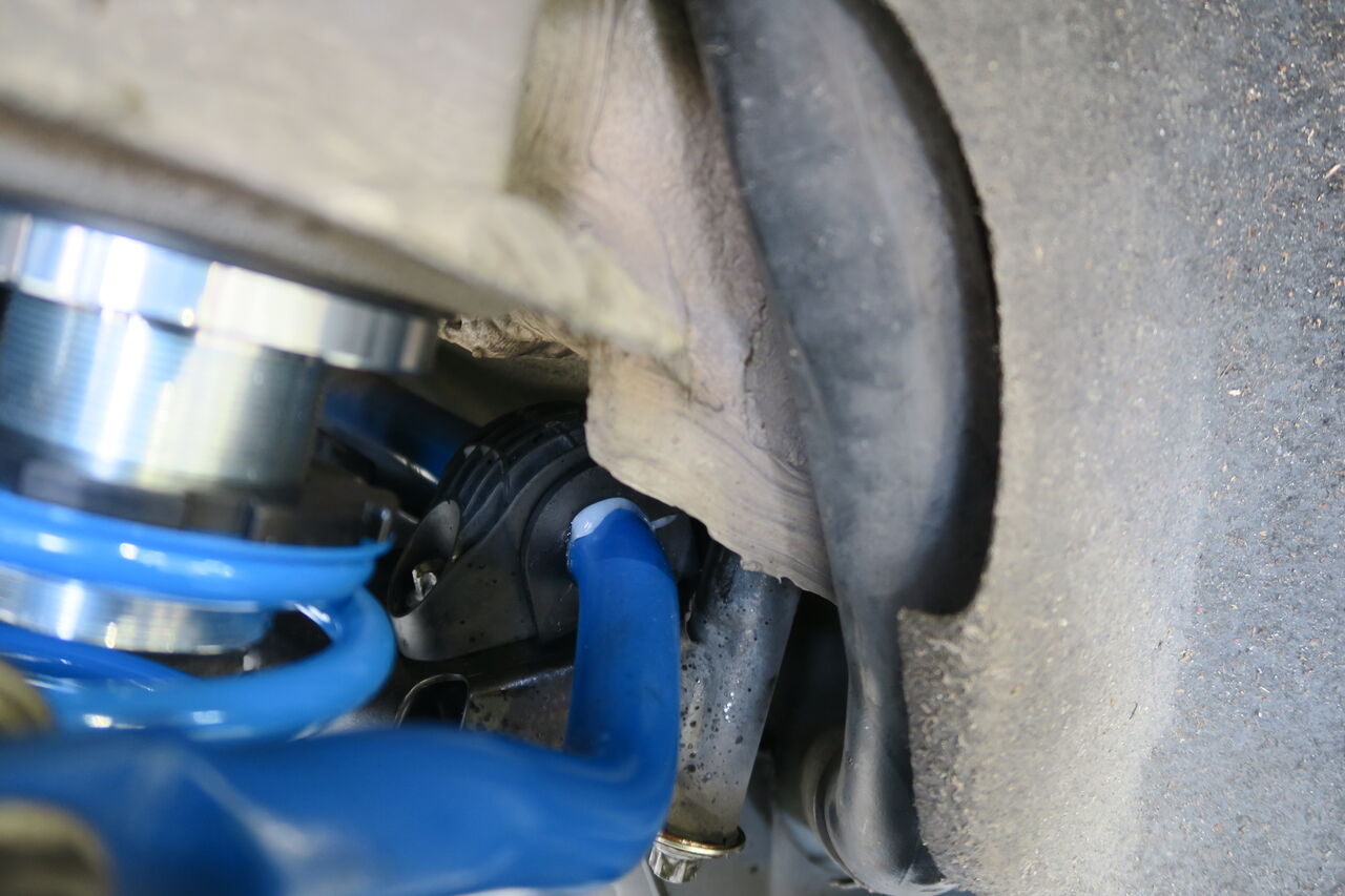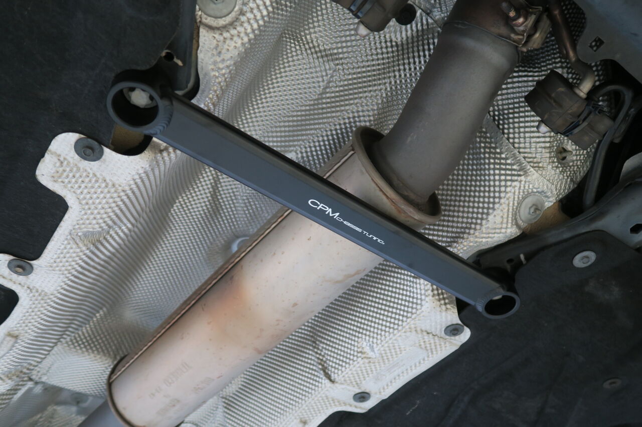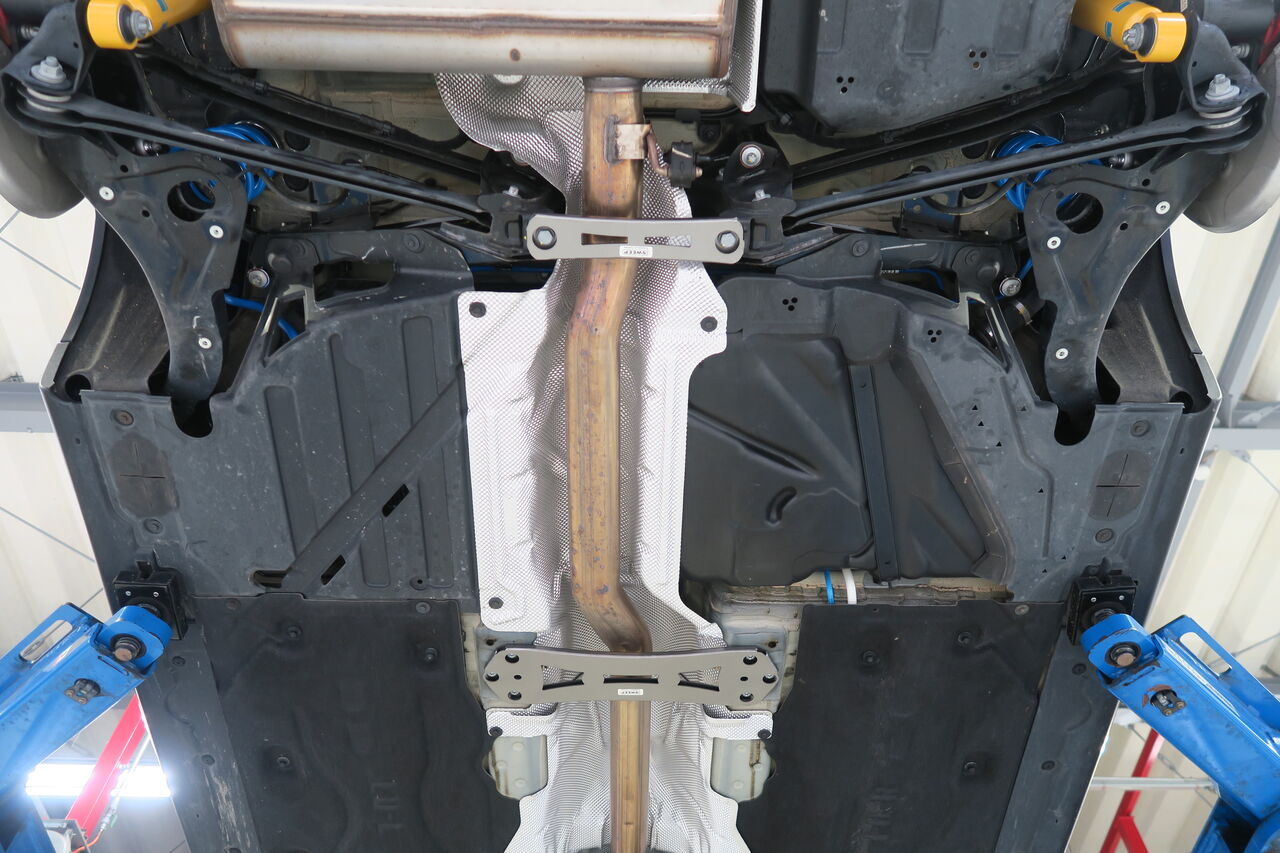 サスペンションアップグレードに合わせてボディ補強としてパワーブレースを3点装着させていただきました。フロントメンバーの捻じれや歪を抑制する「フロントメンバーブレース」、純正スチールプレス製ブレースと交換することで、ボディのフロア剛性を向上させる「センターフロアブレース」、リアサブフレームのコントロールアーム保持部分の剛性強化により、スポーツ走行時やコーナリング時の挙動を安定させる「リアメンバーブレース」の3点を装着しました。iSWEEPボディ補強パーツは、それぞれ取付後の目的を持って設計されていますので、装着すればその違いをきっとご体感頂けます!併せてサブフレームとボディの締結力を高め、正確なハンドリングや快適性を阻害する走行中の“ズレ”を抑制する「iSWEEP Sub-Frame Rigid Collar」とリアスタビライザーリンクを「NM Engineering Rear Adjustable Sway Bar Link」に交換しました。純正のゴムブッシュタイプから高強度のボールジョイントタイプになることでスタビライザーの効果をロスなく発揮させることが出来ます!