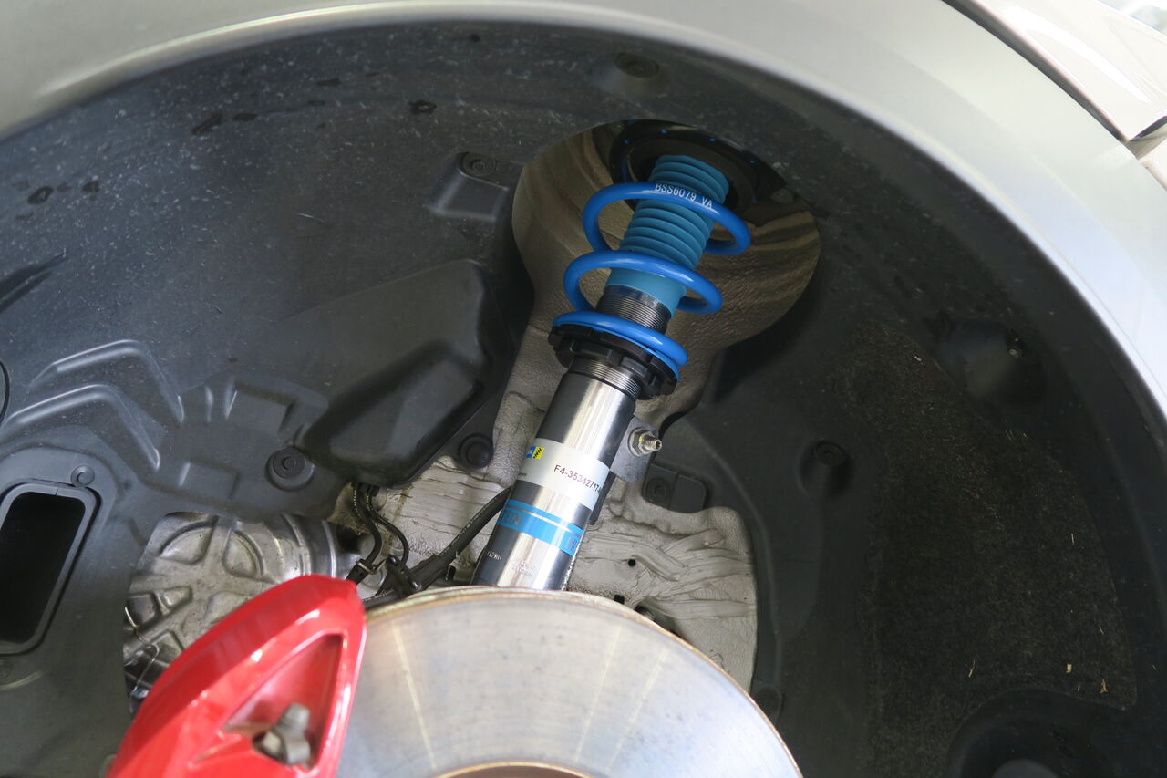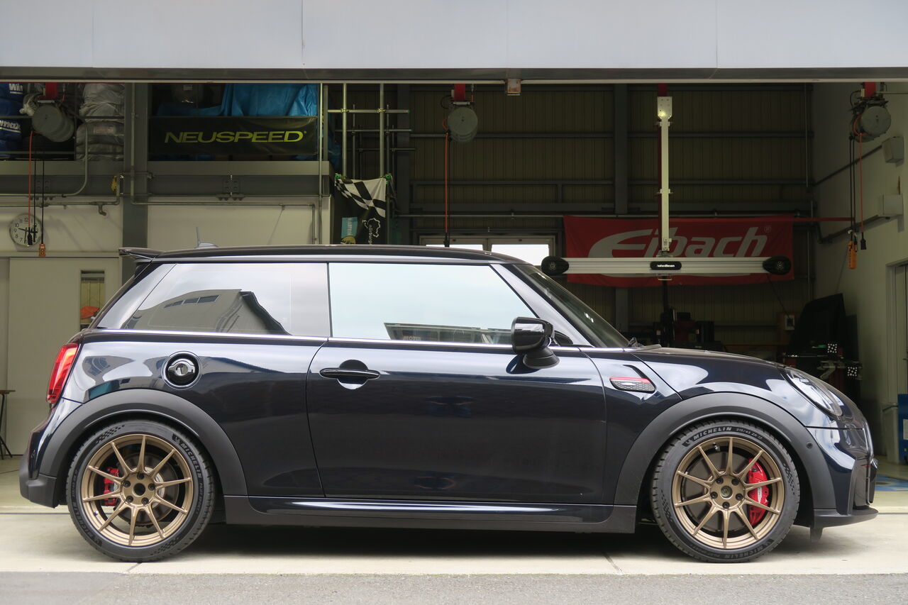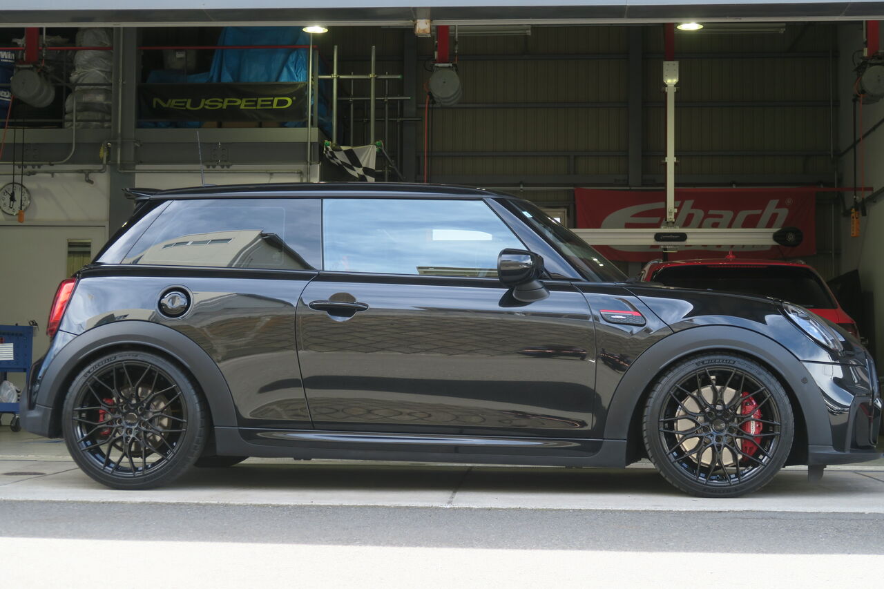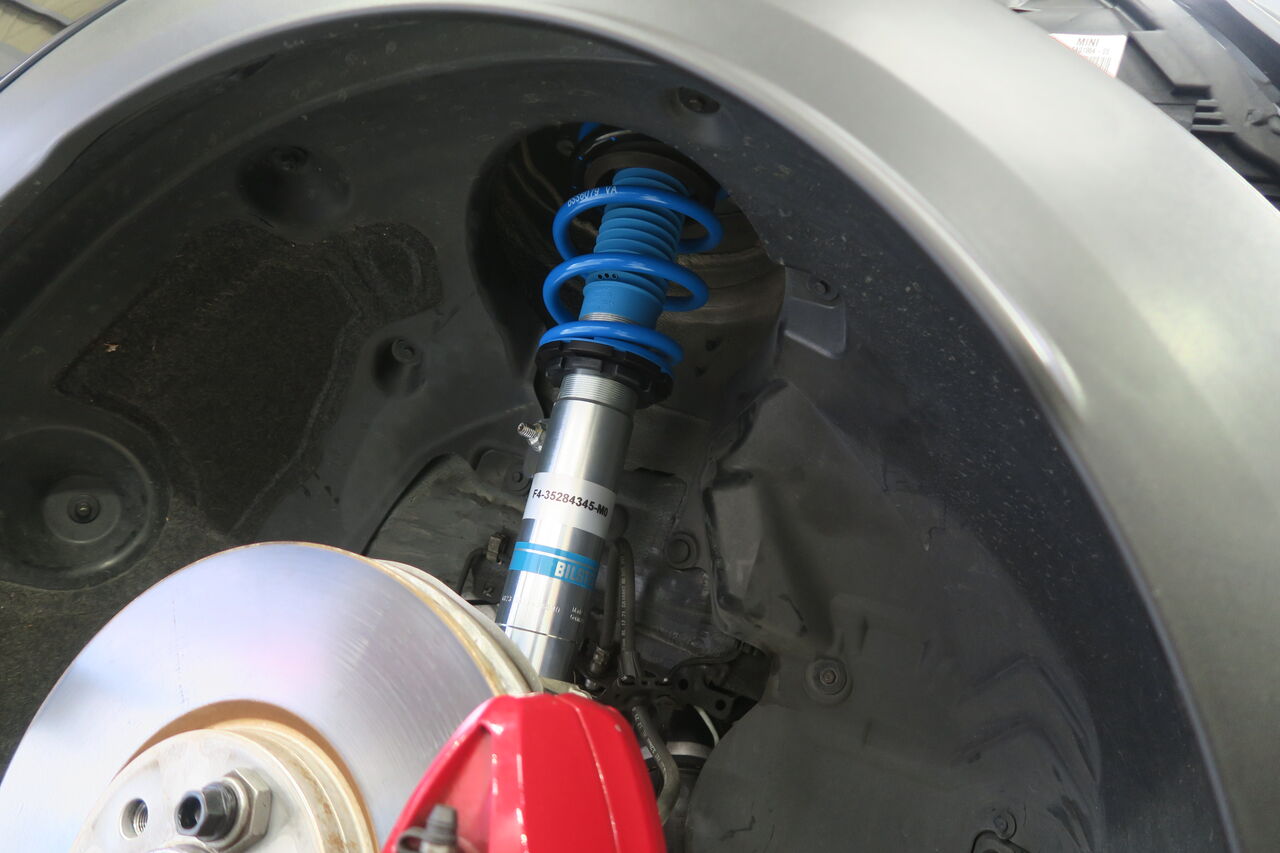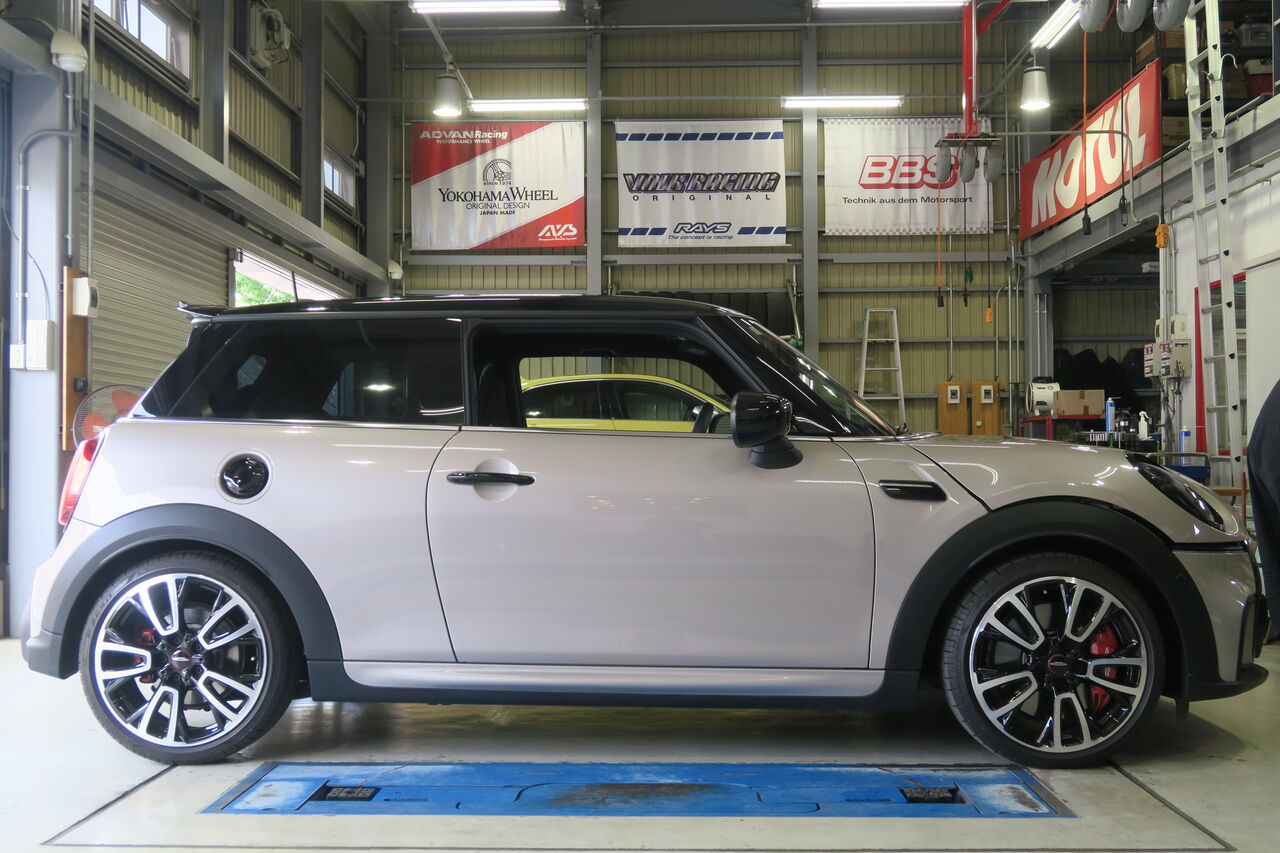 F56 JCW LCI2のトータルチューニングでお預かりしました。まずサスペンションは「BILSTEIN B14」に交換しました。B14は減衰力固定式になりますが、BILSTEIN単筒倒立ダンパーにより幅広いシーンで使用していただけますので日常使用はもちろんスポーツ走行も楽しんでいただけます。車高はお客様の要望に合わせて純正比フロント約30ミリ、リア約20ミリダウンに調整させていただきました。