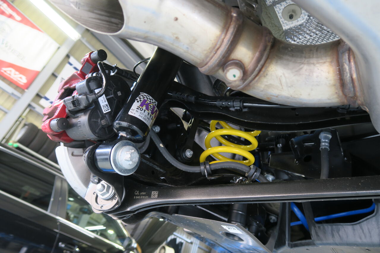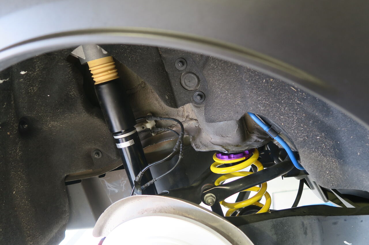 F56 JCW LCI2のローダウン&ブレーキパッド・マフラー交換でお預かりしました。ローダウンには「KW V2 COMFORT」をお選びいただきました。車高を下げつつもコンフォート性を確保しており乗り心地の良い車高調整式サスペンションです。ローダウンスプリングでは調整の出来ない左右差や前後の車高バランスを細かく調整することが出来ますので理想的なフォルムに近づけることが出来ます。ブレーキパッドにはブレーキダストによるホイール汚れの対策として「iSWEEP IS1500」をお選びいただきました。IS1500はブレーキダストの低減と踏力に応じた制動特性が特徴となりカックンブレーキの改善にも効果がありますので運転が楽になります!