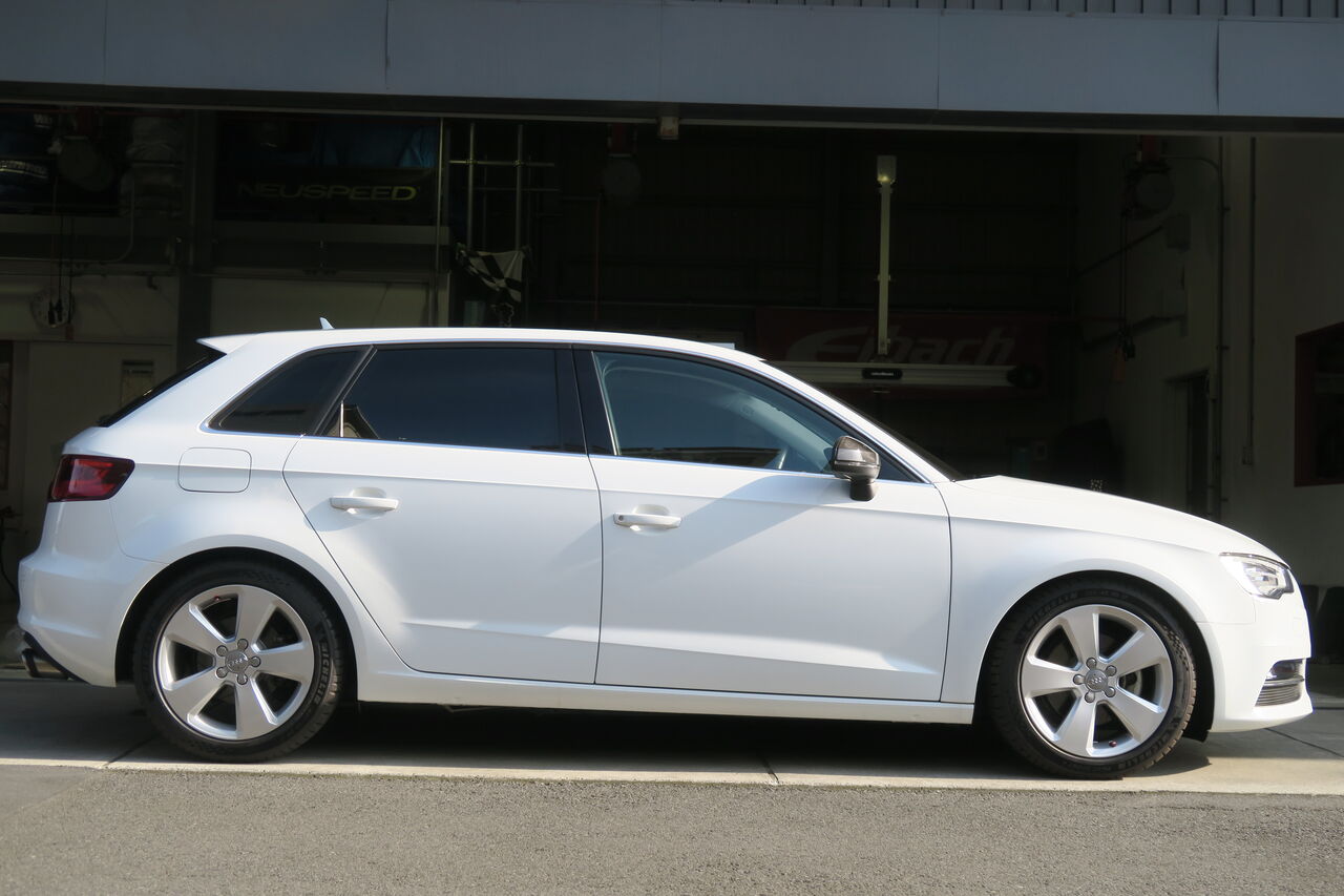 A3(8V) Sportbackに「Eibach PRO-KIT」を装着させていただきました。ダウン量はフロント約20ミリ、リア約15ミリとなりました。純正で目立っていたフェンダーとタイヤのクリアランスは適度になくなりスタイリッシュなフォルムへと変化しました!ローダウンによりアライメントが大きく変わりますので装着後は3Dアライメントテスターで調整を行い完成です。