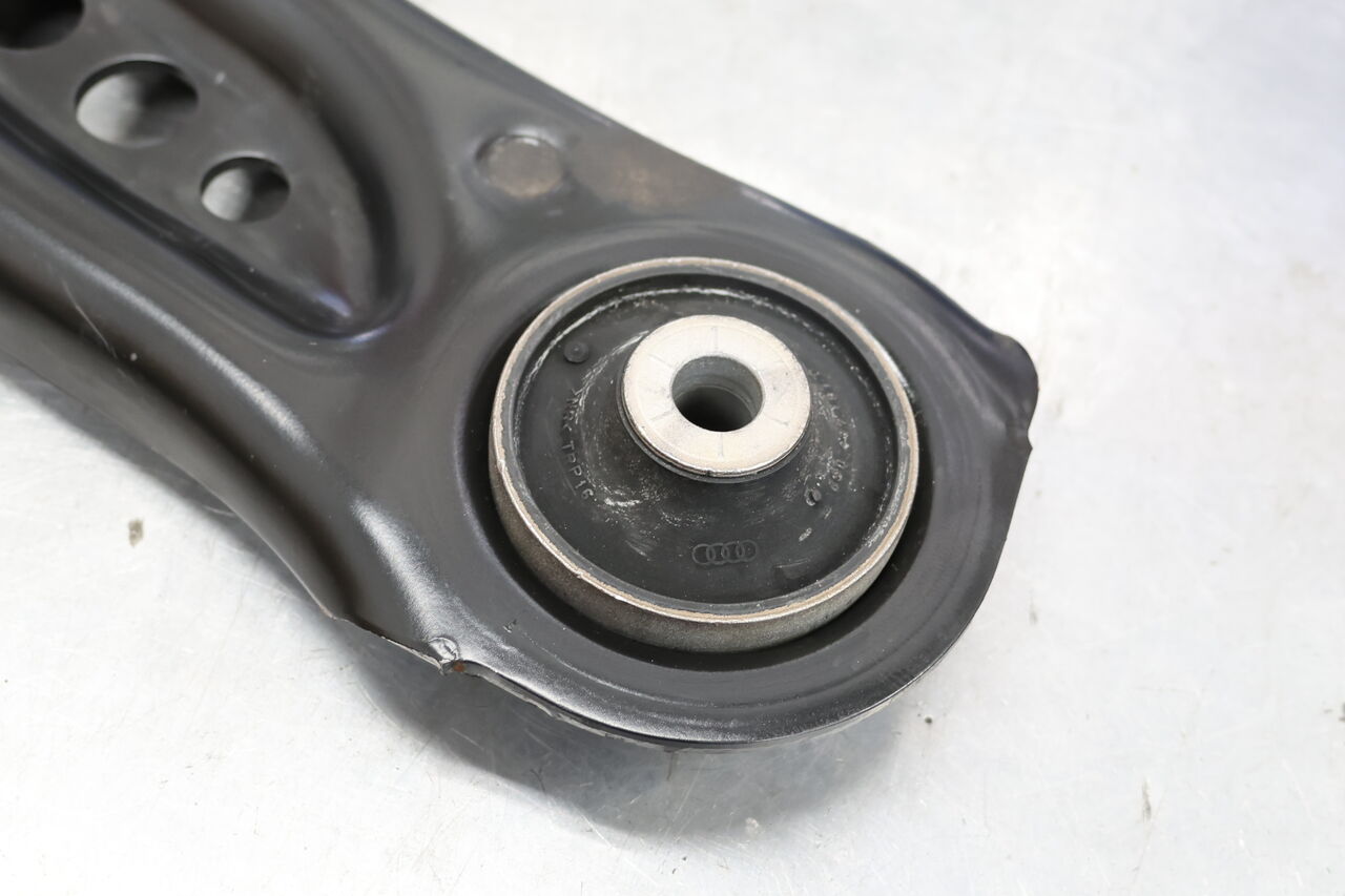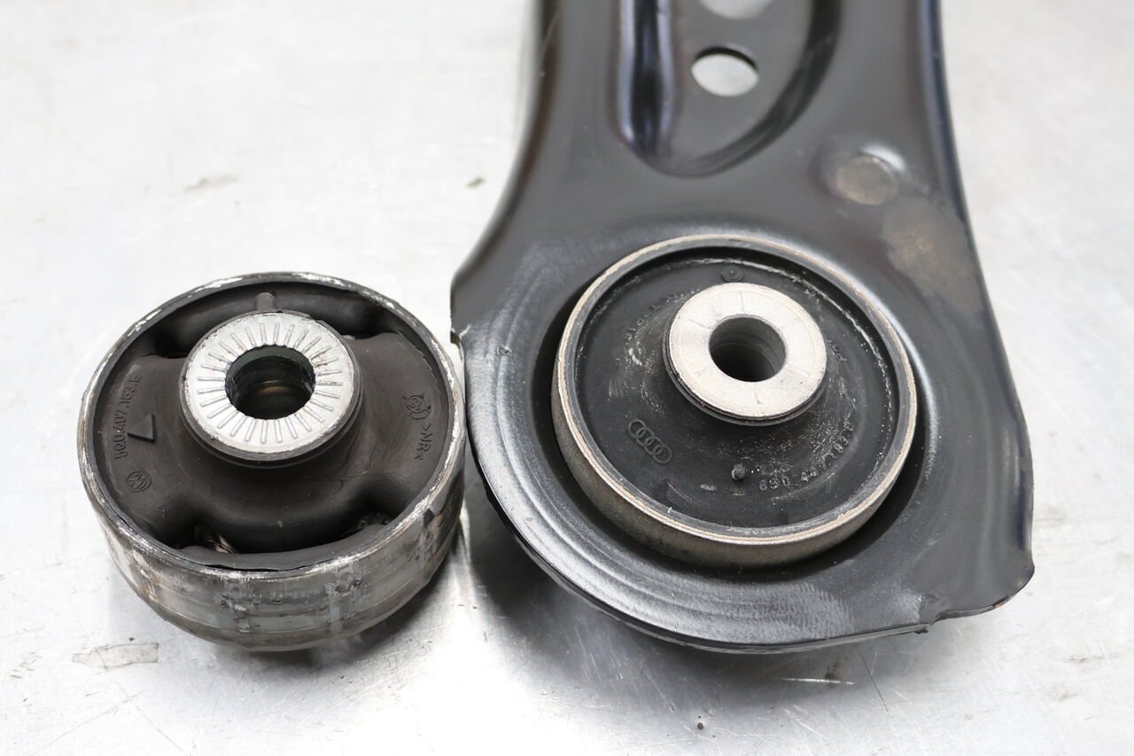 GOLF7 Rのフロントロアアームブッシュ交換でお預かりしました。ロアアームブッシュは経年劣化により亀裂が入っておりましたので、リフレッシュついでに中実タイプのブッシュに交換しました。純正ではフロントロアアームのサブフレーム側取り付け部のブッシュは肉抜きがされており、この空洞部分は走行中に力を受けて常に変形しロアアームの角度も合わせて変化します。中実タイプにすることでロアアームの不要な動きを抑制し、しっかりとした走りを実現します!最後に4輪アライメント調整を行い完成です。