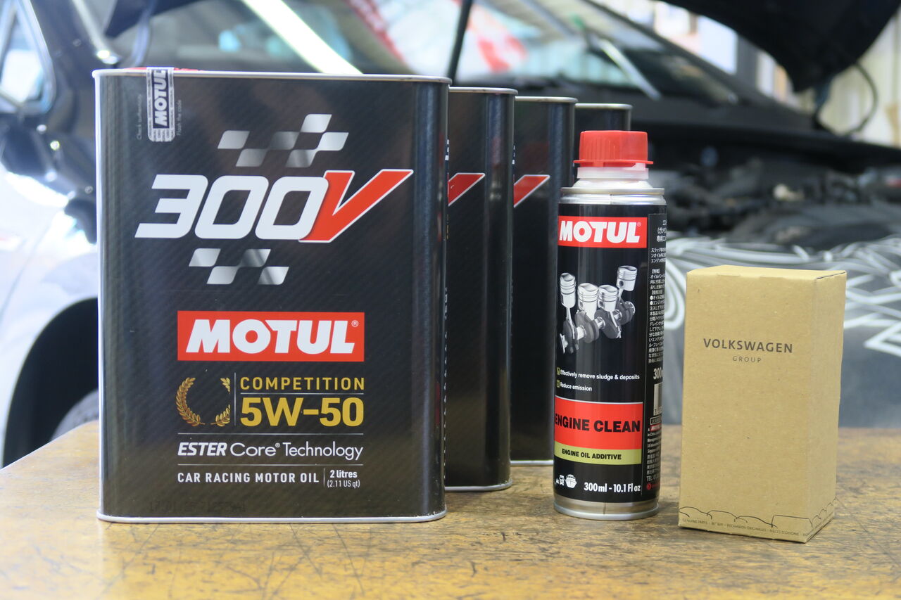 GOLF7.5 R Variantのエンジンオイル交換&オイルキャッチタンク装着にご来店いただきました。エンジン内部洗浄「フラッシング」を施工し、エンジンオイルにはサーキットでのスポーツ走行を考慮した「MOTUL 300V COMPETITION 10W-40」を使用しました。