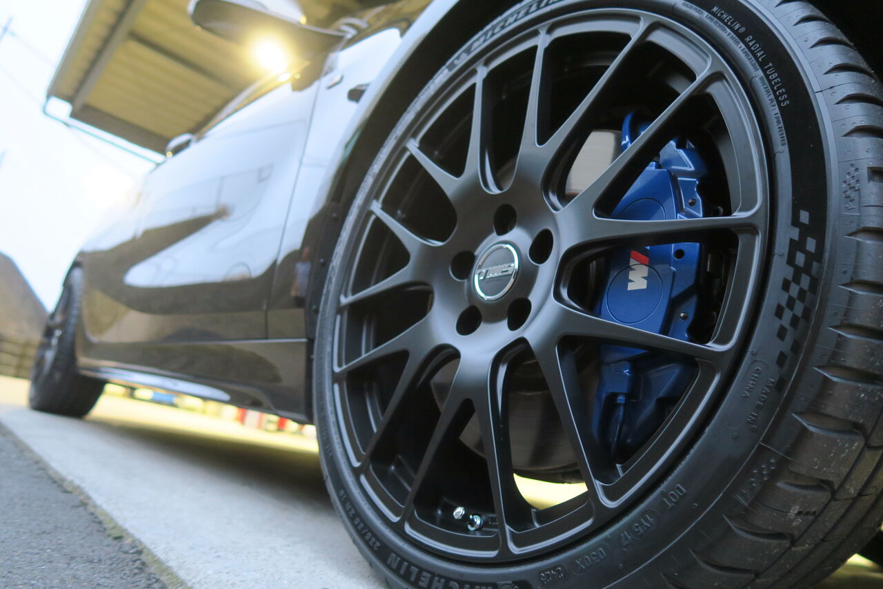 M135iのホイール交換でご入庫いただきました。純正18インチから19インチへインチアップして「TWS EXlete 107M Monoblock 19×8.0J+45」をお選びいただきました。エクステリアを黒で統一しながらも光沢のあるボディに対してフラットブラックが足元を引き締めます。もちろん走りの面でも鍛造モノブロックならではの軽量化が効きスポーツモデル❝M❞の走行性能を引きたててくれます。タイヤにはMICHELIN PS5を装着することで純正ランフラットタイヤのネガティブな側面を解消し、しなやかで滑らかなドライブフィールを提供します。ie_staff_blog at 20:28|Permalink│